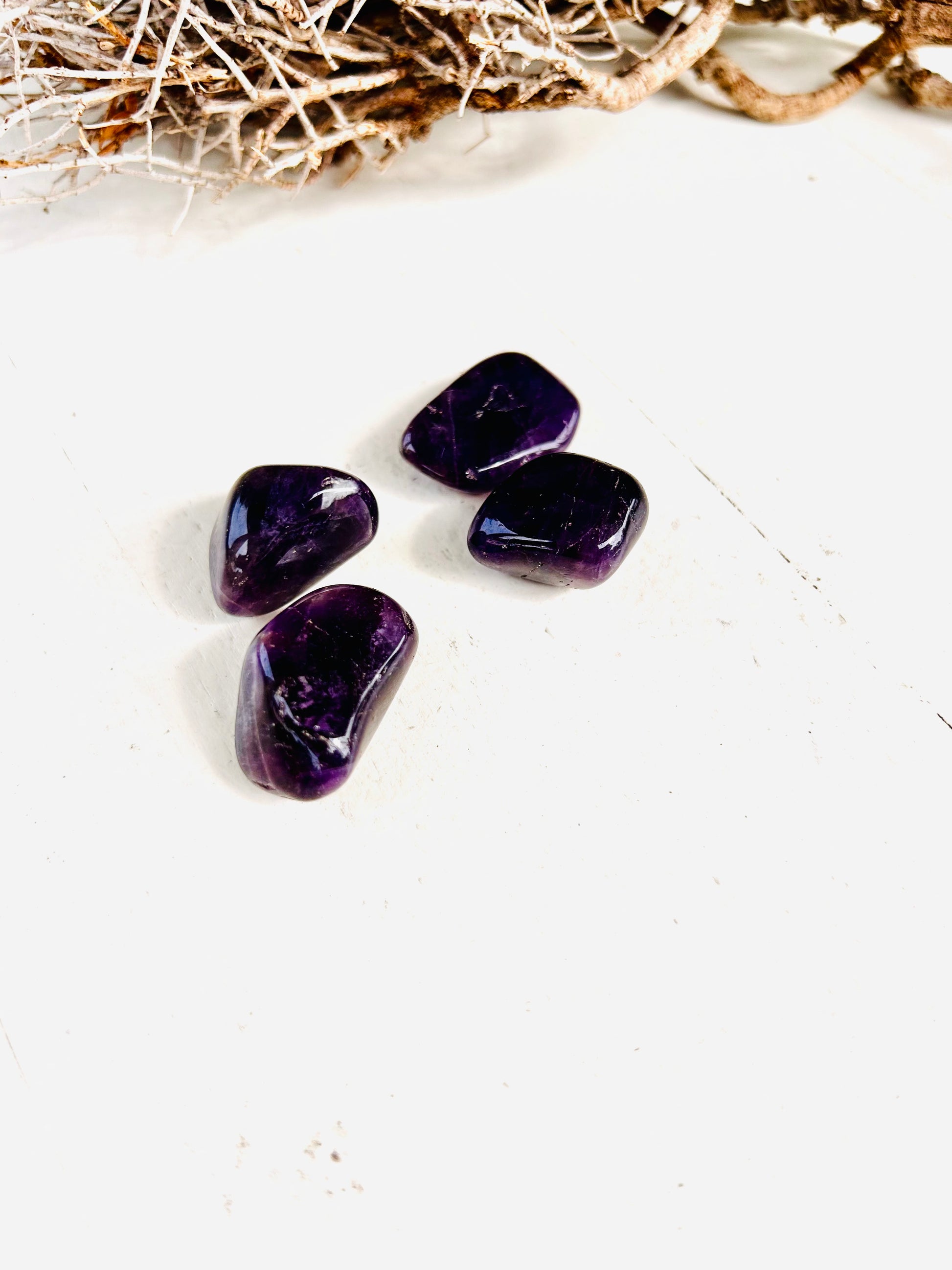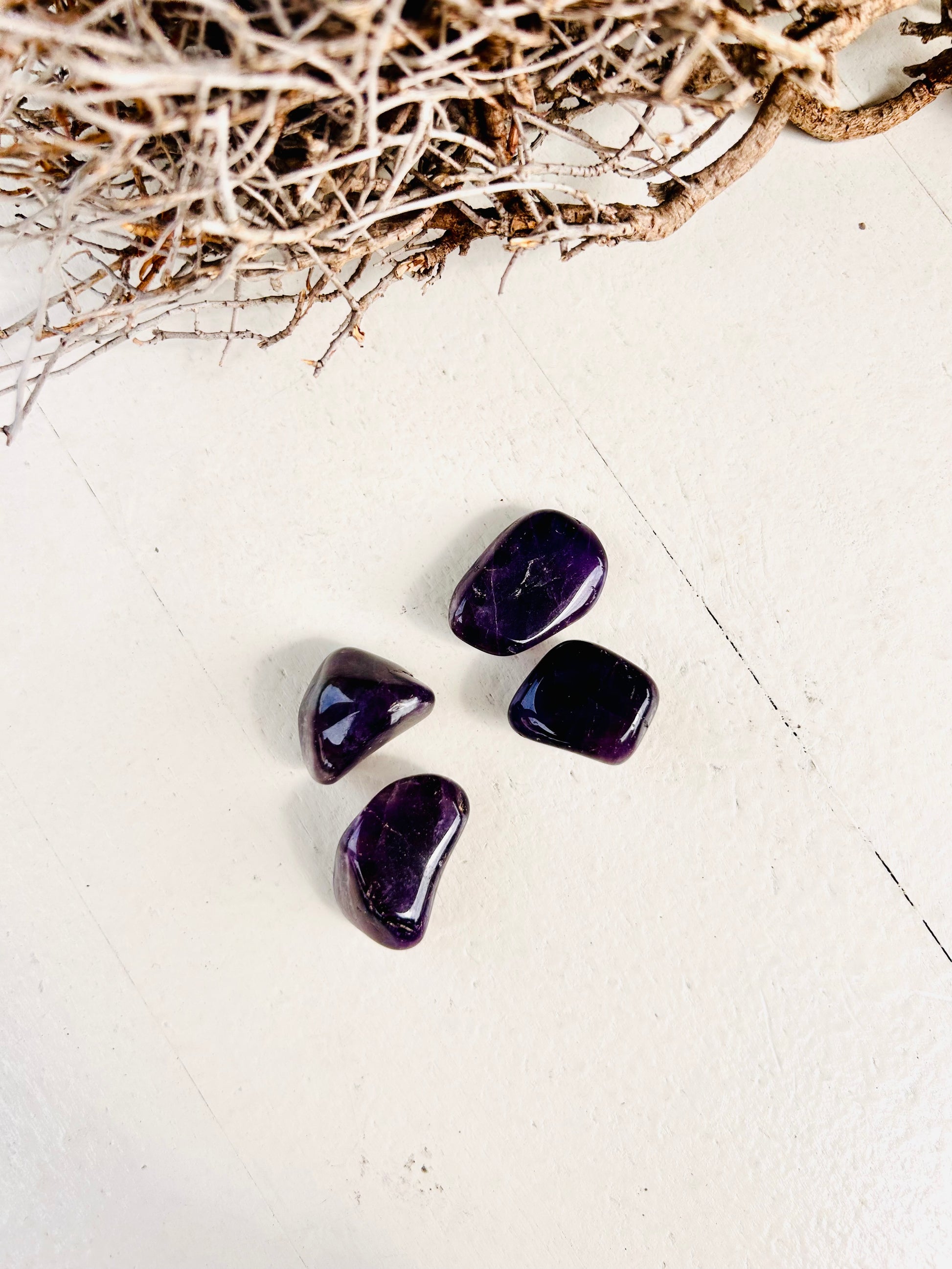 Diese Trommelsteine tragen die Kraft des Amethysts in einem besonders tiefen, dunklen Violett. Jeder Stein ist ein Unikat, zwischen ca. 2 und 3,5 cm groß, und schimmert in einem intensiven, kräftigen Farbton – geheimnisvoll und elegant zugleich.