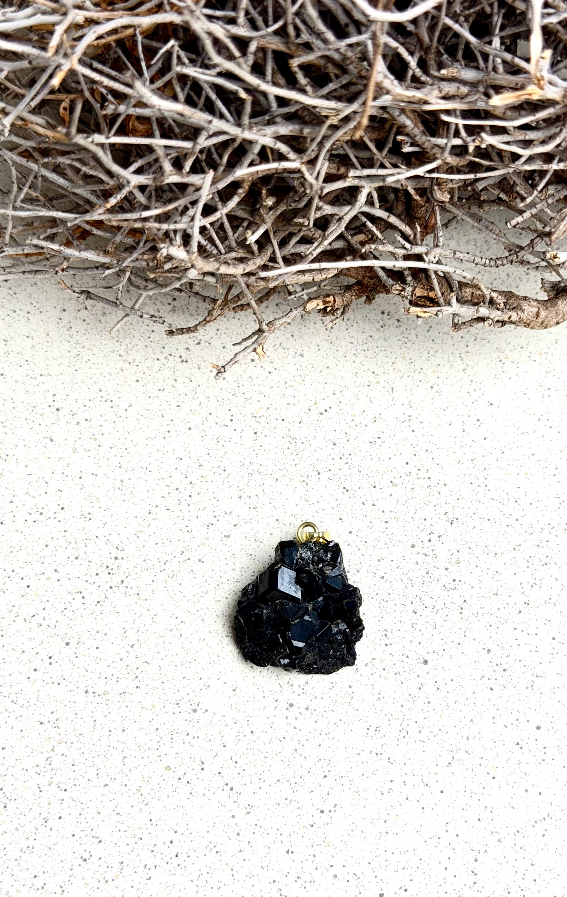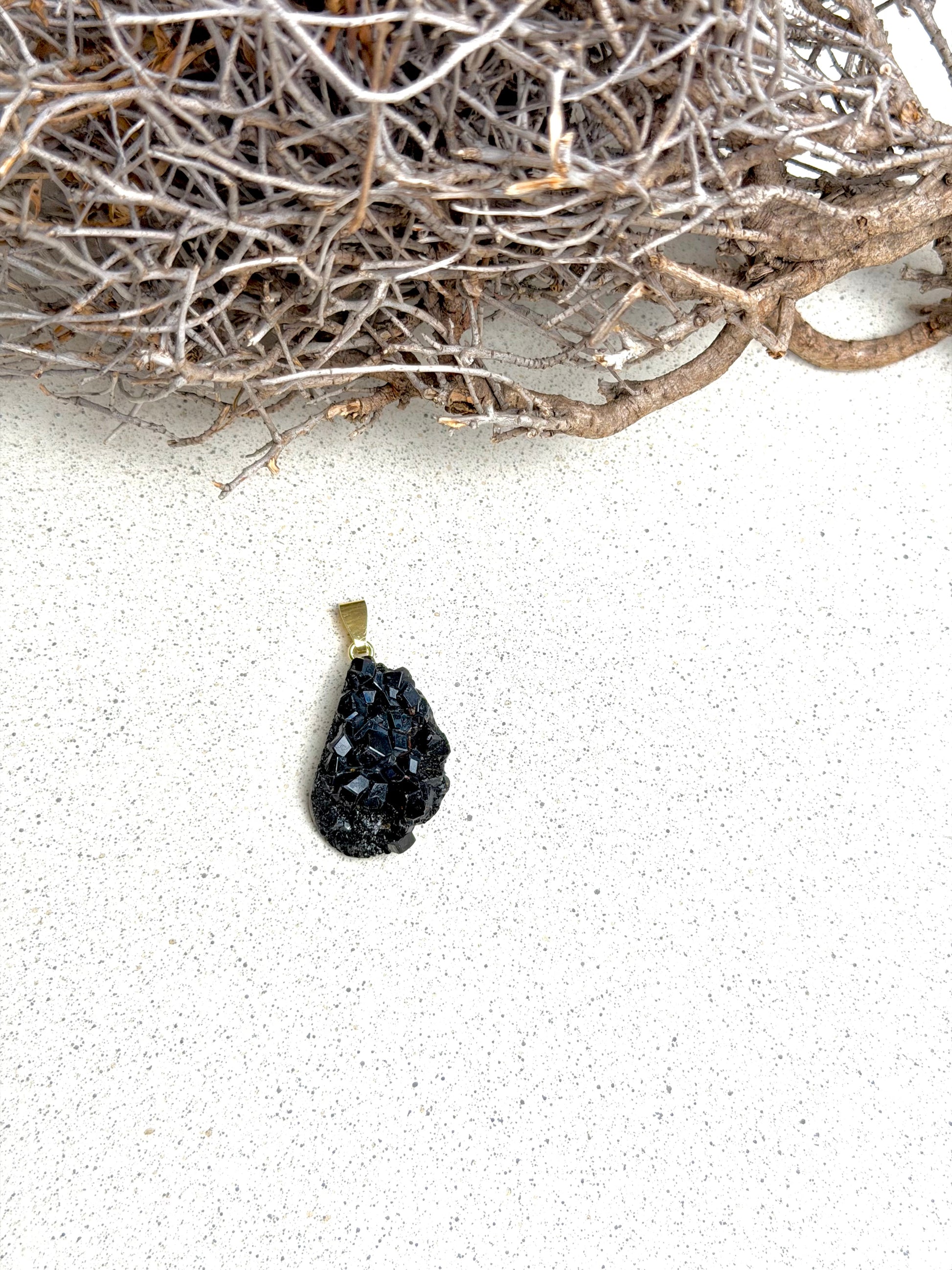 Diese Andradit-Anhänger tragen die kraftvolle, erdige Intensität eines der stärksten Granate in sich. Die feinen Kristallstrukturen und das dunkle, fast metallische Schimmern machen jeden Anhänger zu einem ausdrucksstarken Unikat – roh, ursprünglich und voller Präsenz.