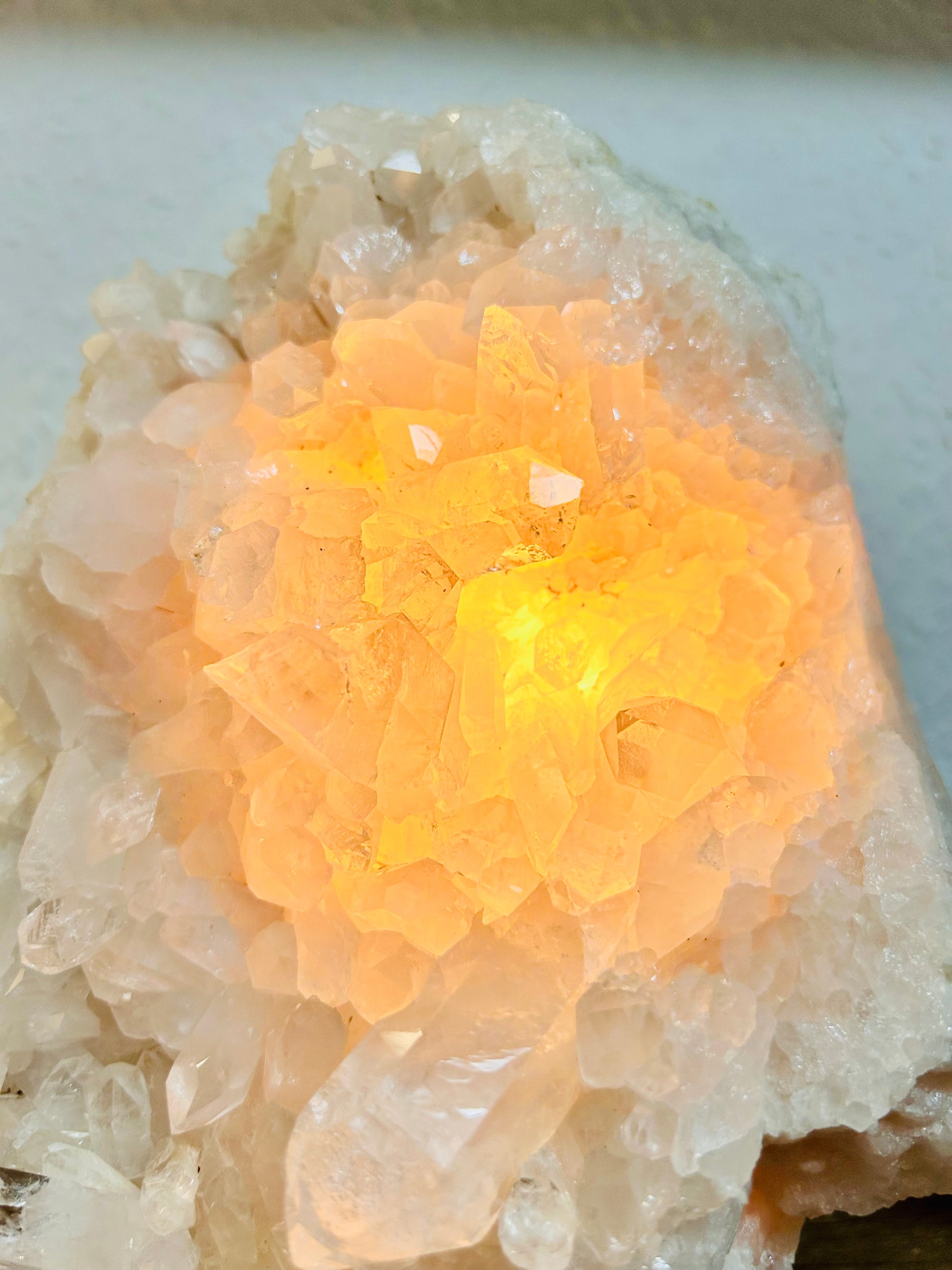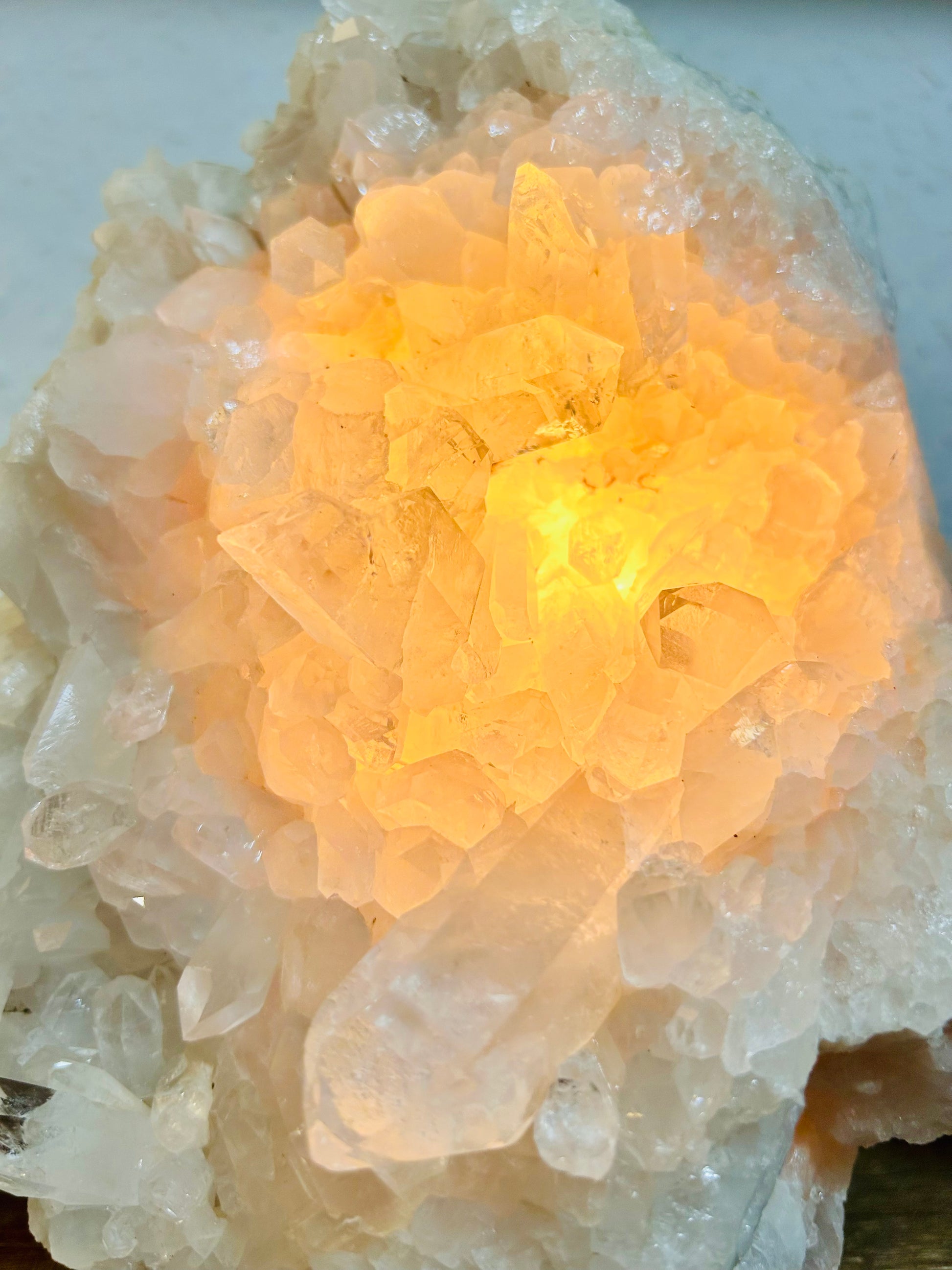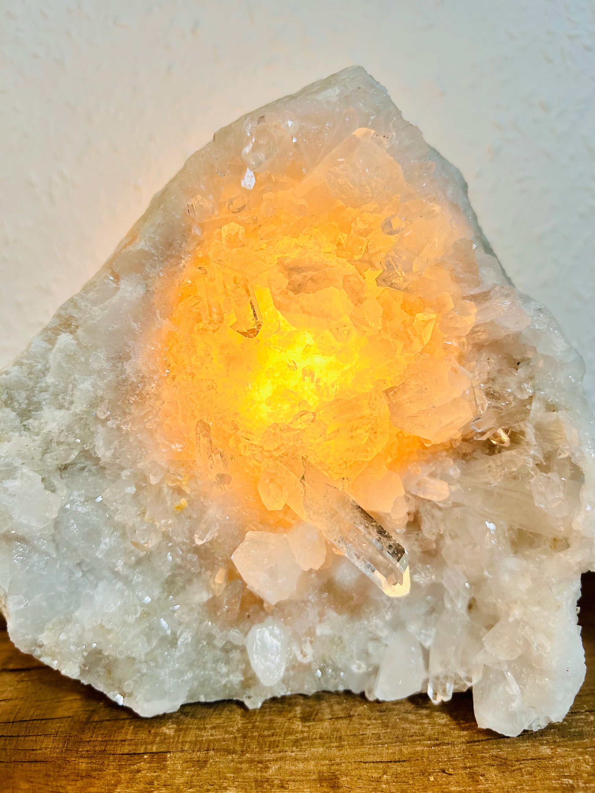 Der Bergkristall ist bekannt als Meister der Heilsteine – er klärt die Raumenergie, stärkt die Konzentration und unterstützt dabei, eine ruhige und ausgeglichene Atmosphäre zu schaffen. Das warme Licht, das durch die Bergkristallspitzen strahlt, verstärkt diese Wirkung und sorgt für eine angenehme, beruhigende Stimmung.