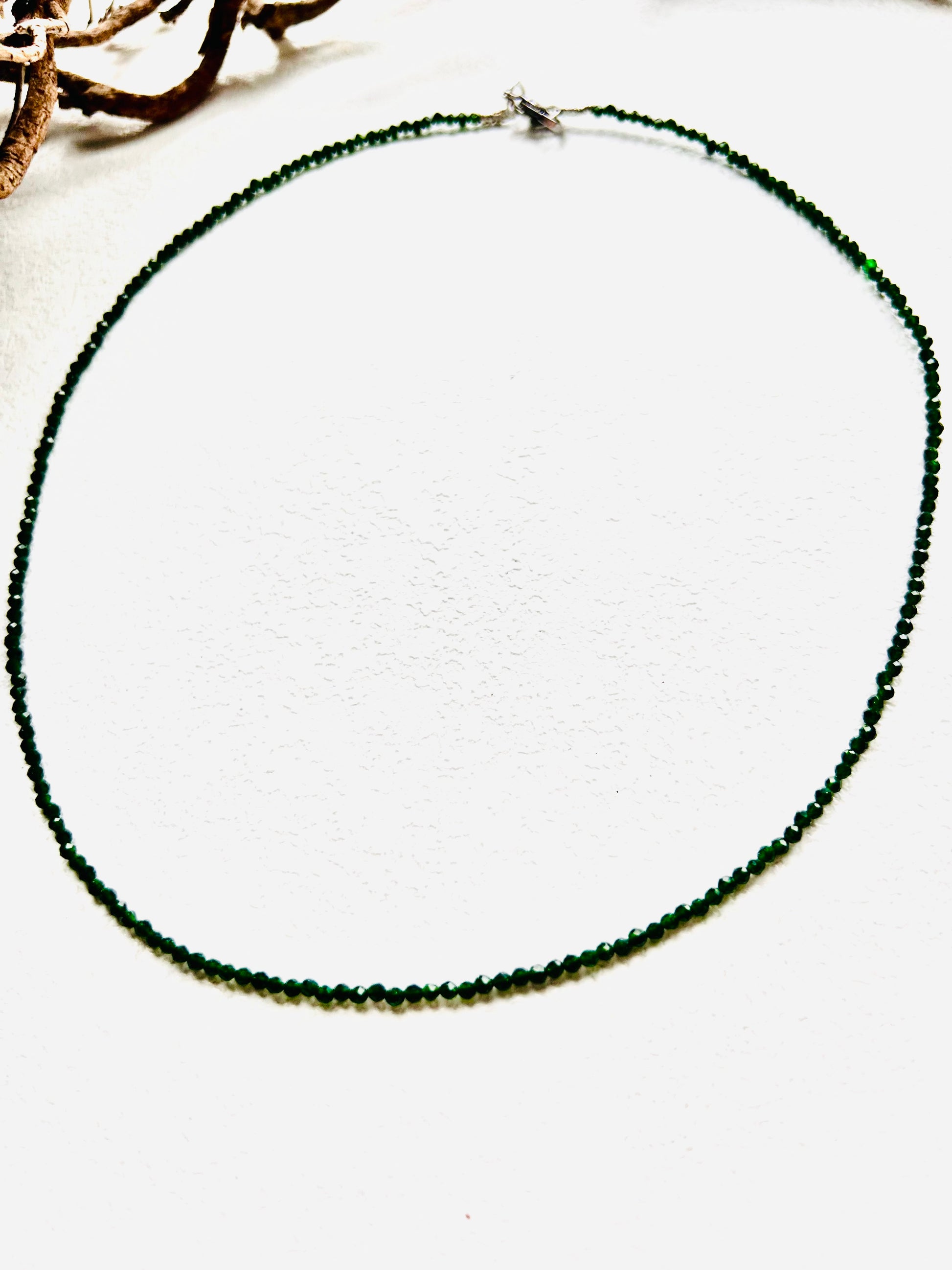 Tiefgrün, klar und voller Naturkraft – diese feine Kette aus facettiertem Chromdiopsid wirkt elegant und zugleich ganz geerdet. Die kleinen, funkelnden Kugeln erinnern an moosbedeckte Wälder und frische Waldluft.