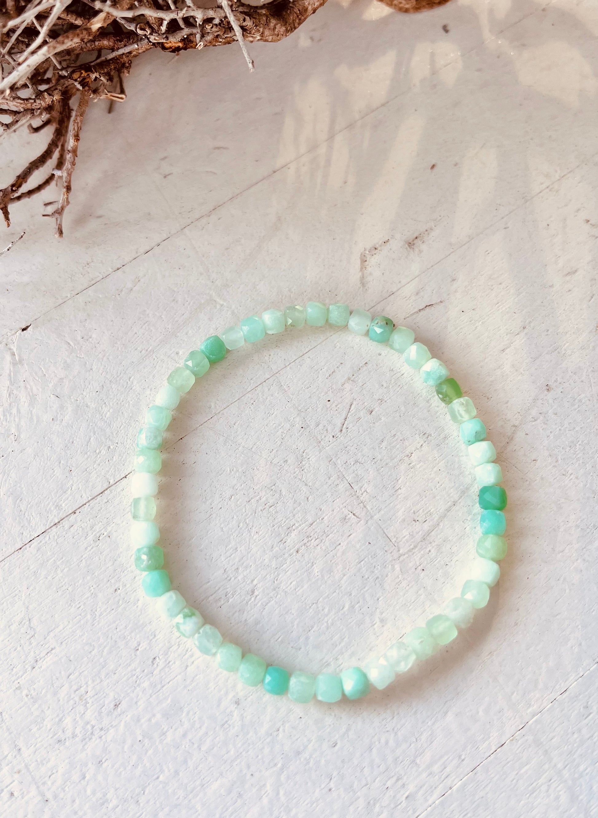 Dieses wunderschöne Chrysopras-Armband besticht durch seine edlen, facettierten 4x4 mm Würfel, die in einem zarten Grün leuchten und auf der Haut sanft schimmern. Mit einer Länge von 18-19 cm passt es sich wunderbar an das Handgelenk an und ist ein eleganter Begleiter für jeden Tag.