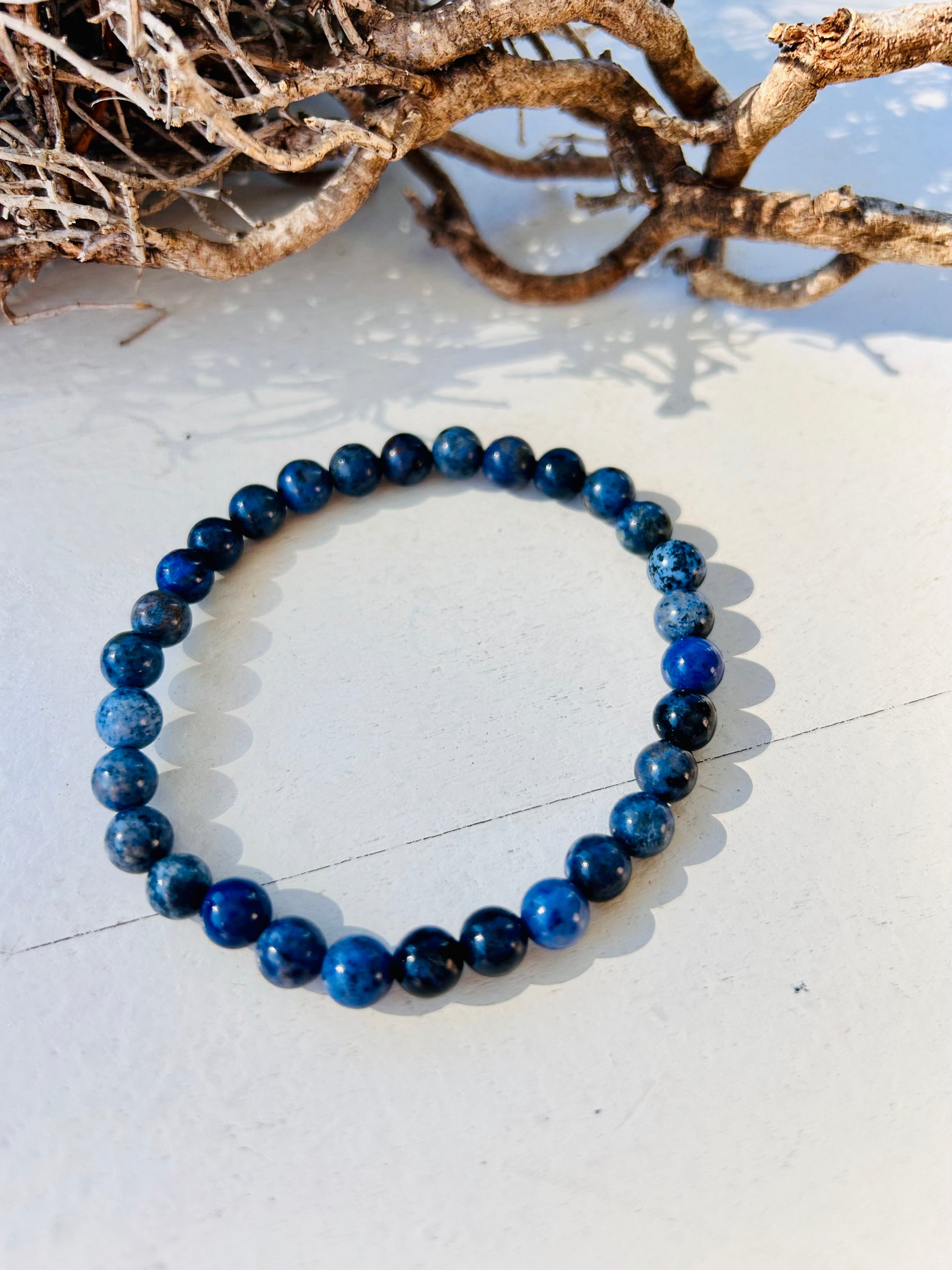 Dieses Armband besteht aus 6 oder 4 mm großen Dumortierit-Perlen und hat eine Länge von ca. 19 cm. Der Dumortierit ist ein Stein der mentalen Stärke, Disziplin und Klarheit. Er fördert Konzentration, logisches Denken und hilft dabei, neue Informationen besser zu verarbeiten. Besonders geschätzt wird er von Menschen, die ihre Geduld stärken, ihre Intuition schärfen oder ihre Ausdauer in herausfordernden Situationen verbessern möchten.