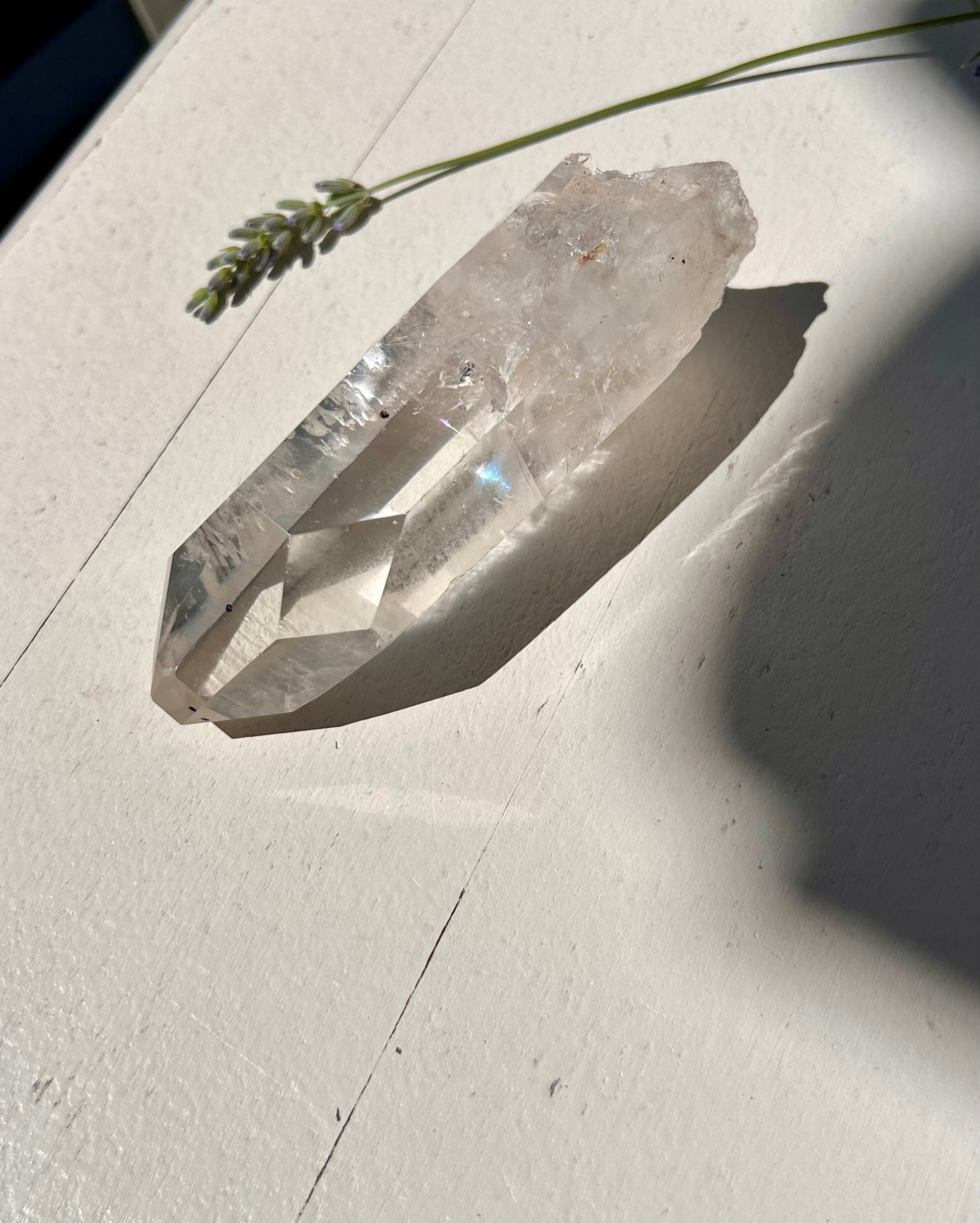 Besonders kraftvoll bei diesem Stück: In seiner Wurzel funkeln leuchtende Regenbogen-Inklusen, die ihn wie lebendig wirken lassen. Regenbögen im Kristall stehen für Hoffnung, Transformation, Frequenzanhebung und göttliche Verbundenheit.