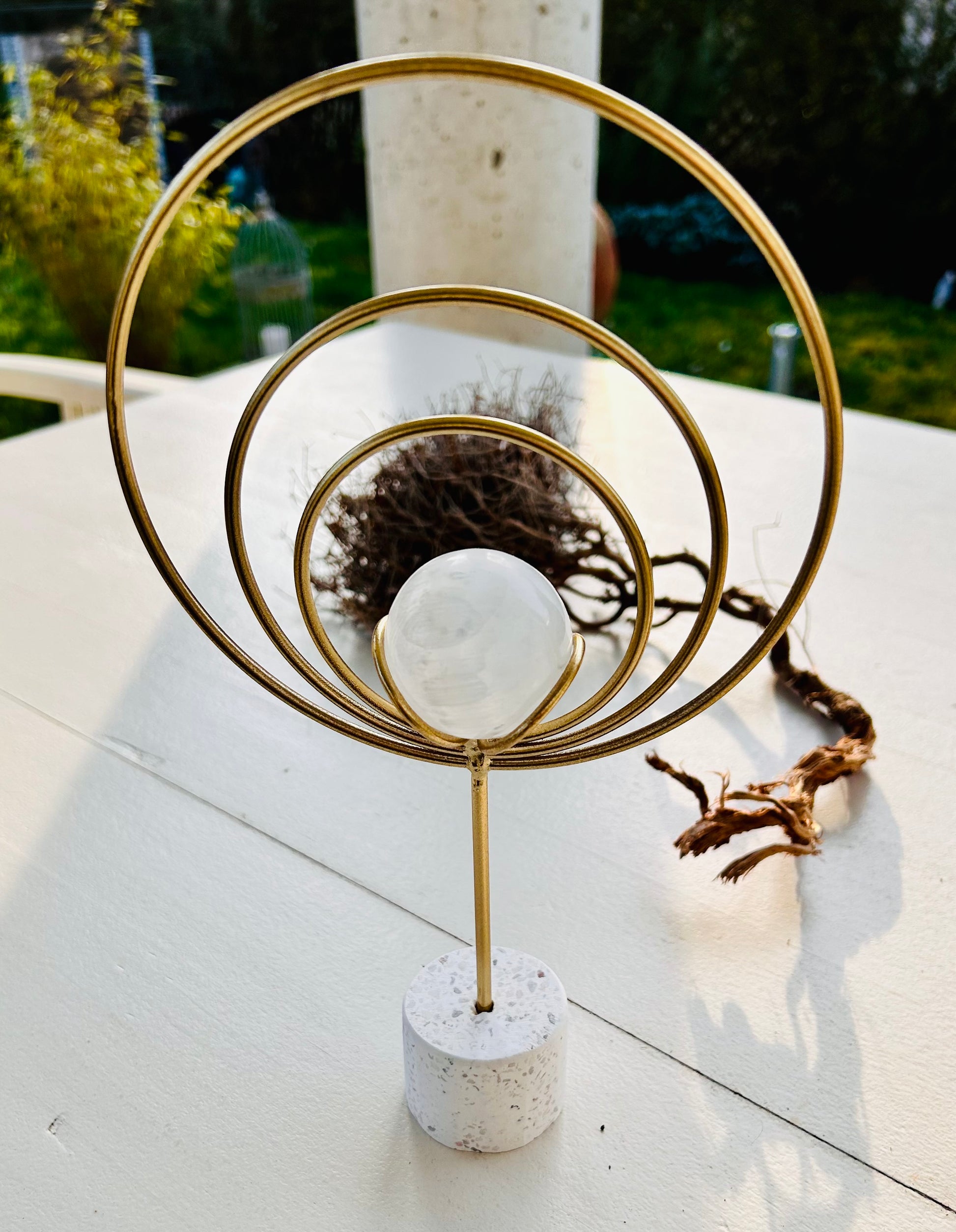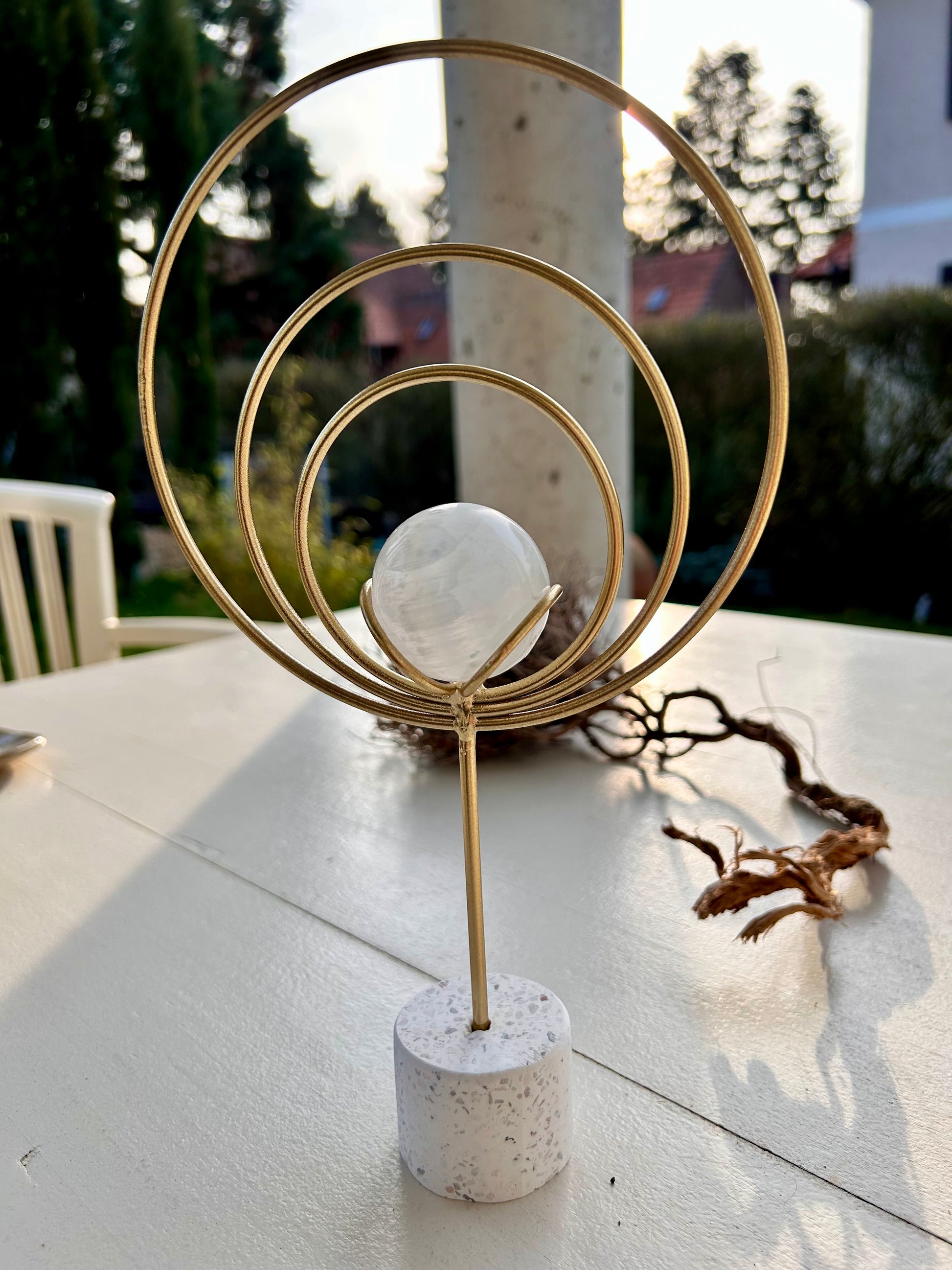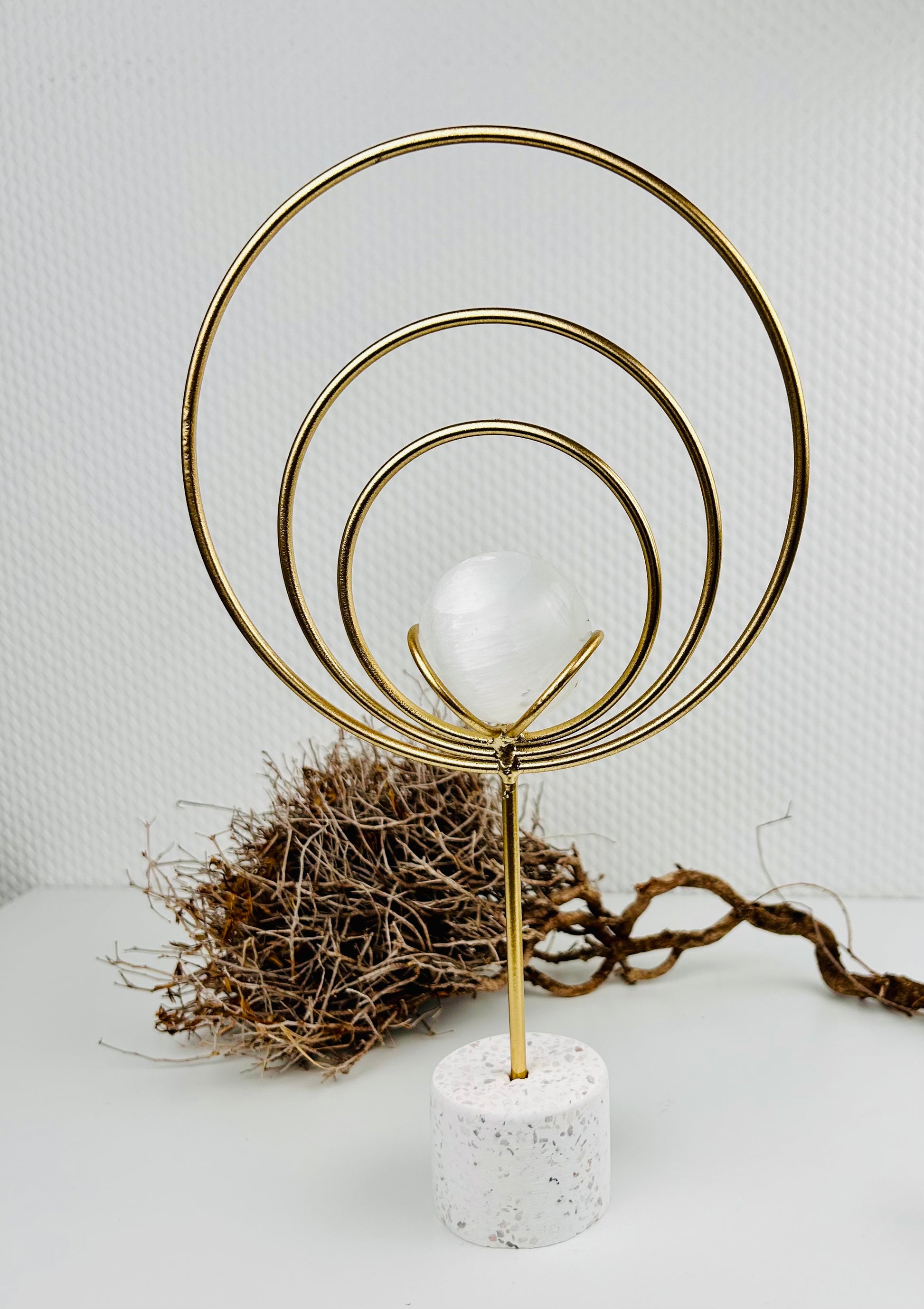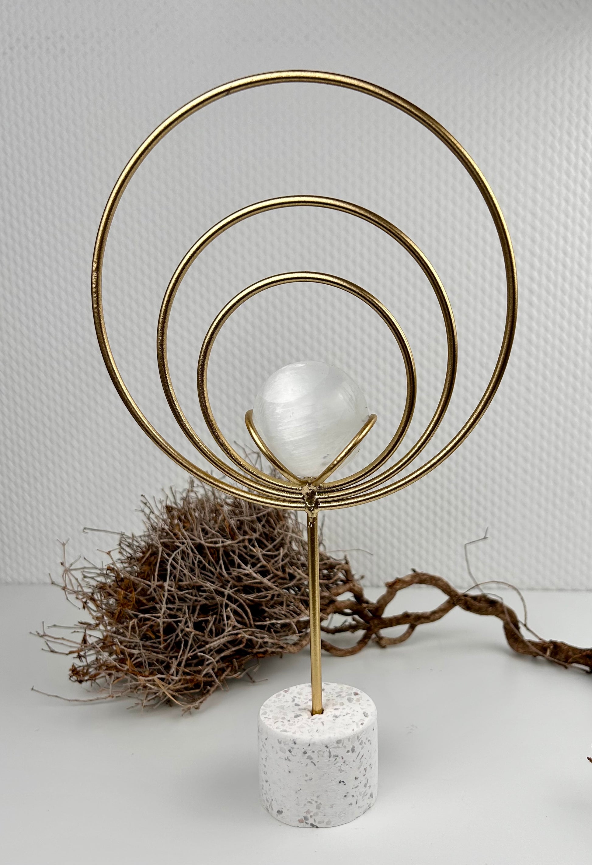 Das Herzstück dieses Ständers ist die Selenitkugel mit einem Durchmesser von 4 cm, die auf ihm ruht. Selenit, bekannt für seine reinigenden und energetisierenden Eigenschaften, fängt das Licht ein und strahlt eine sanfte, beruhigende Aura aus.