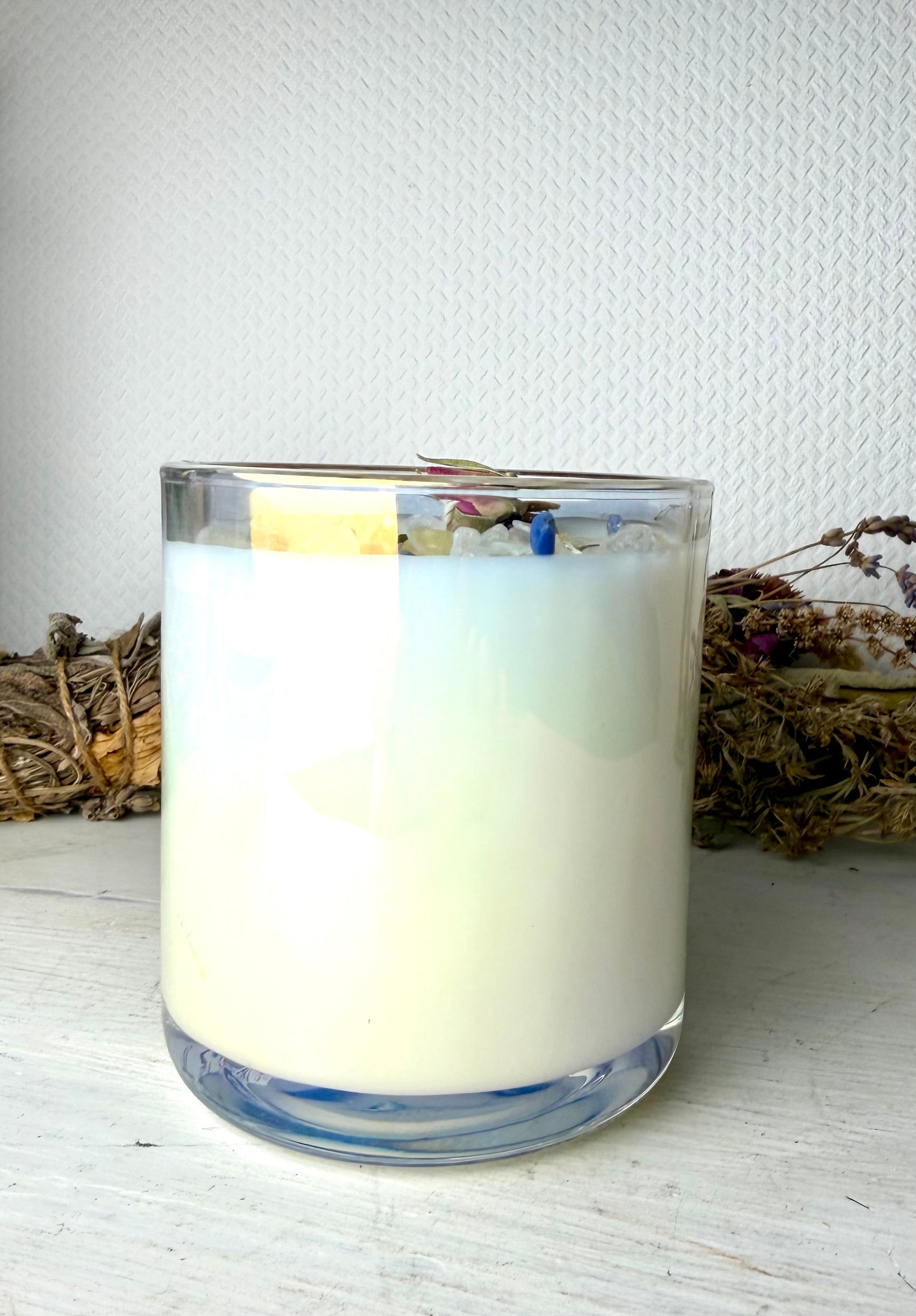 Gegossen in ein edles 200-ml-Glas in Aura-Optik, veredelt mit kleinen Kristallen und zarten Rosenblüten. Jede Kerze ist ein kleines Kunstobjekt – nach dem Abbrennen bleibt ein wunderschönes Glas zur Wiederverwendung als Windlicht, Vase oder stilvoller Ritualbecher.