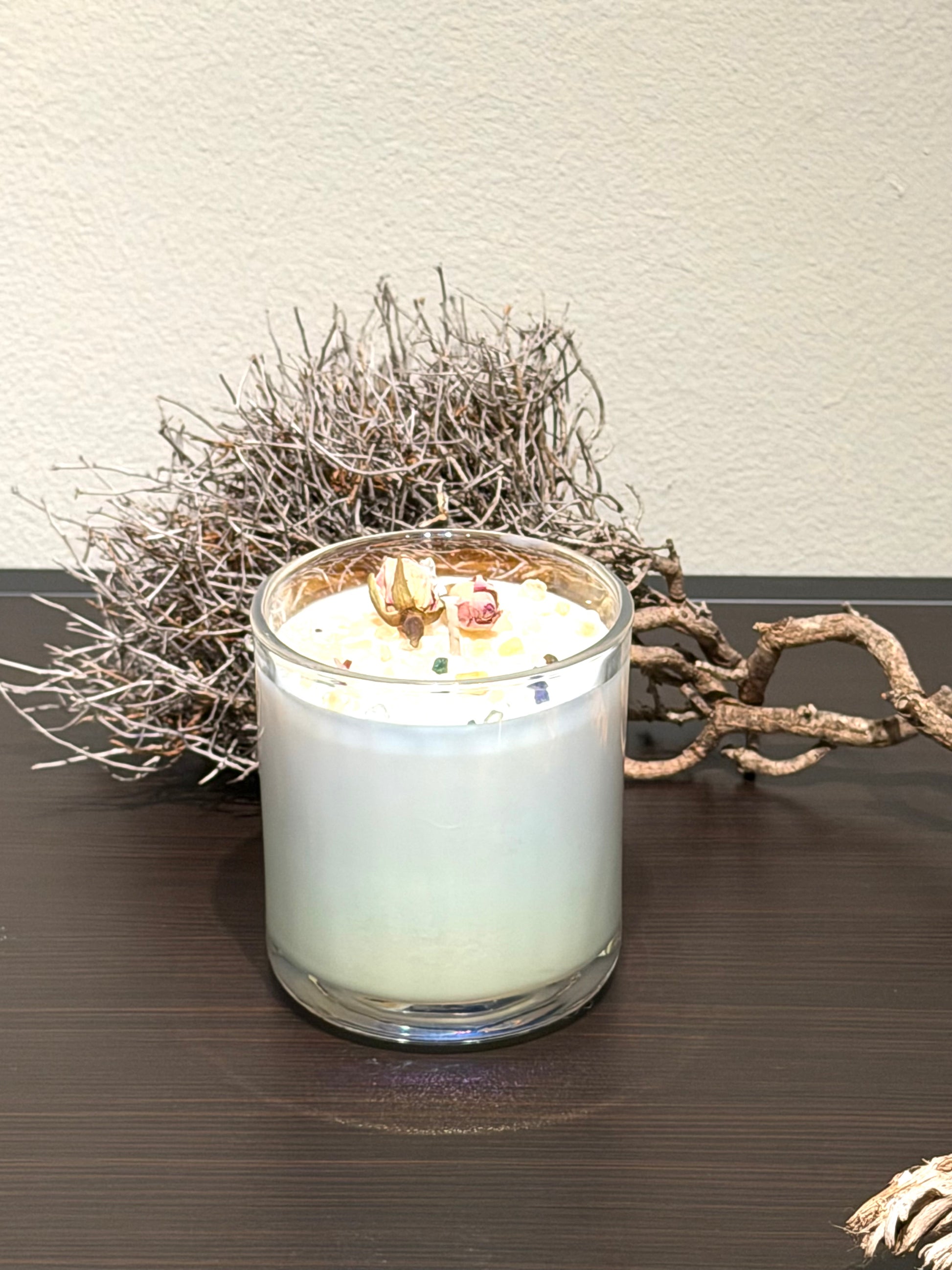 Veredelt mit kleinen Kristallen und zarten Rosenblüten wird jede Kerze zu einem einzigartigen Stück, das Atmosphäre schafft und Räume mit sanfter Wärme erfüllt.