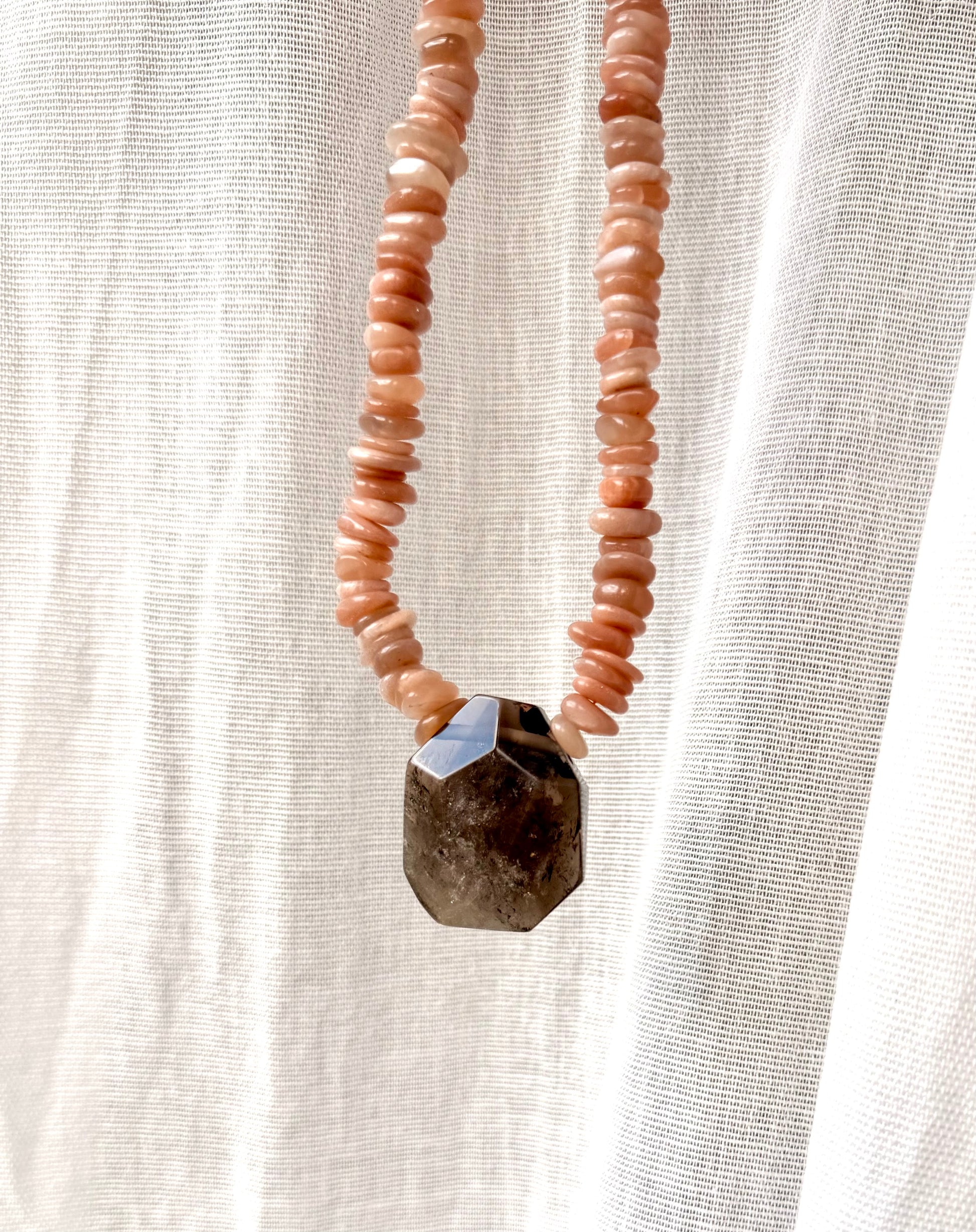 Handgefertigte Kette aus Mondstein-Scheibensteinen mit Rauchquarz Anhänger.