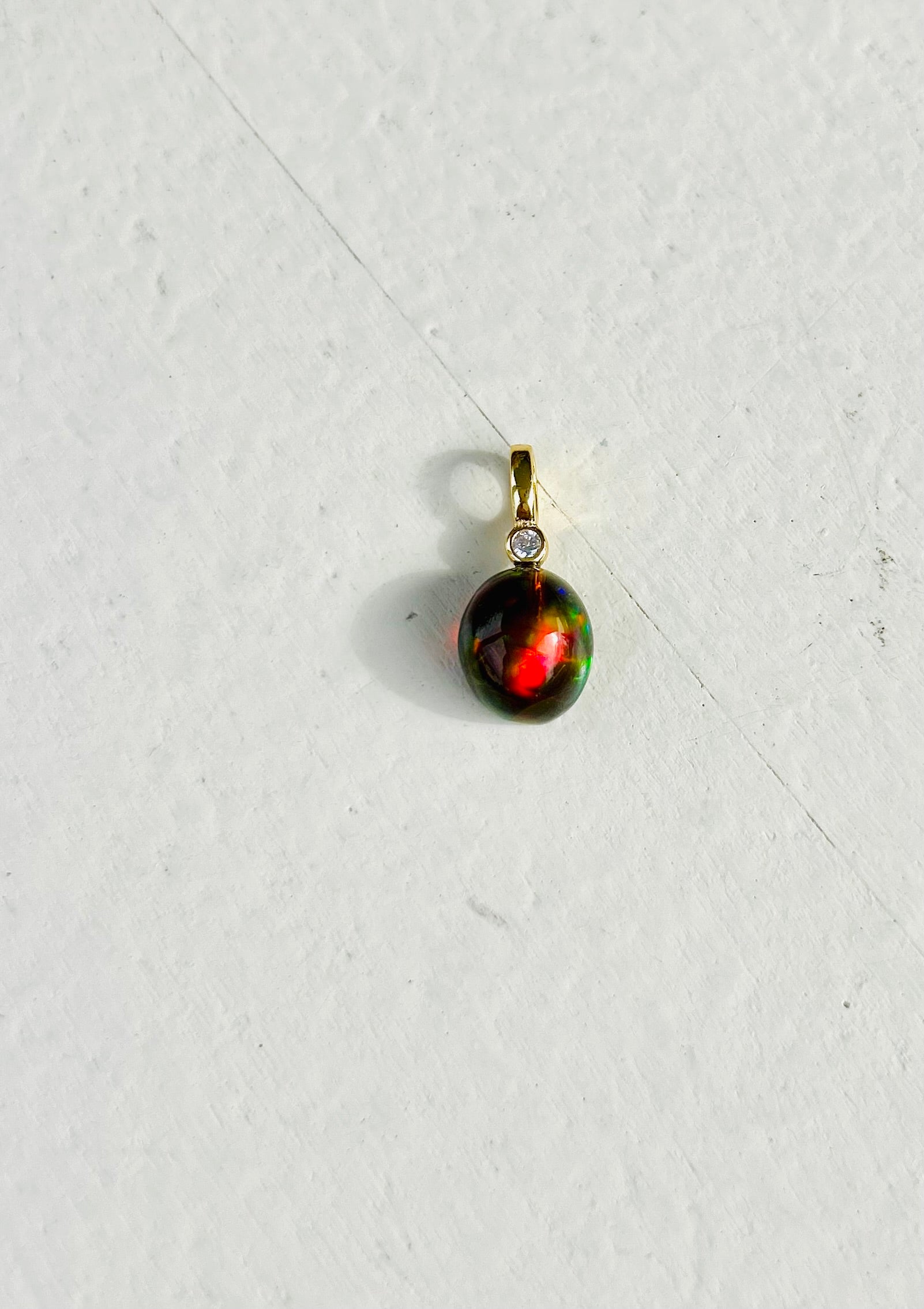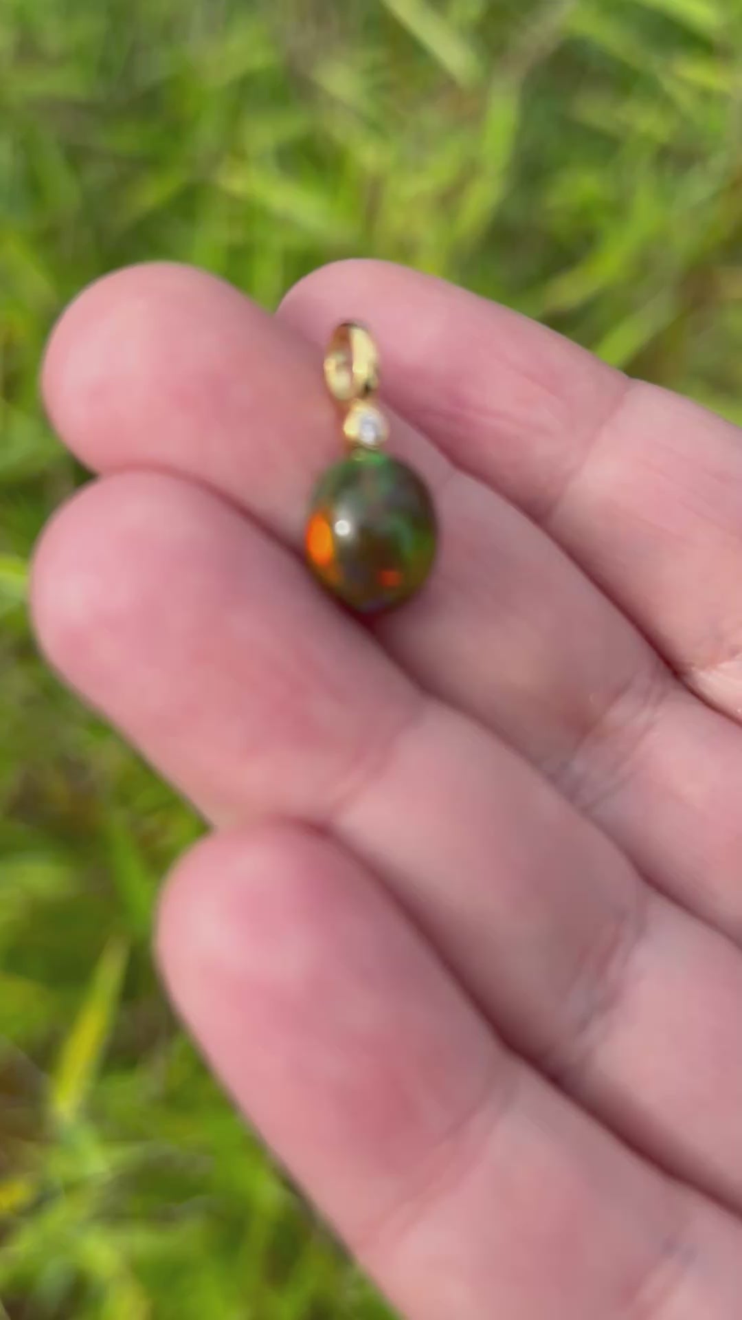 Dieser Opal-Anhänger ist ein absolutes Einzelstück – durchscheinend und voller lebendiger Farbreflexe in Grün, Orange und Braun. Die feinen Schattierungen verleihen ihm eine besondere Tiefe und machen jedes Lichtspiel zu einem Erlebnis. Gehalten wird er von einer edlen, vergoldeten 925-Silberöse, verziert mit einem kleinen Schmuckstein, der die Eleganz des Anhängers unterstreicht.