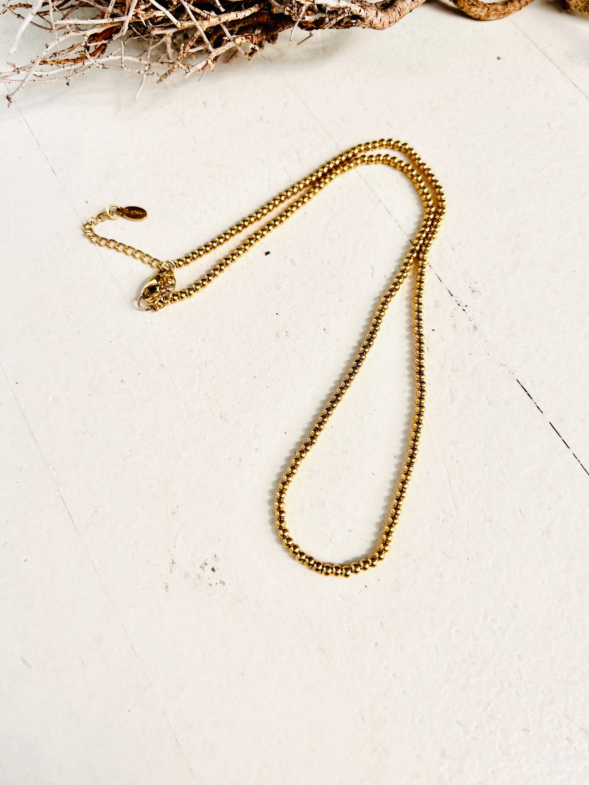 Schlicht, zart und vielseitig: Diese feine Kette aus Edelstahl ist in Silber oder Gold erhältlich. Mit einer Länge von 39 cm + 5 cm Verlängerung und filigranen 2,5 mm Kugeln trägt sie sich leicht und elegant – ob alleine oder als Basis für deine liebsten Anhänger.