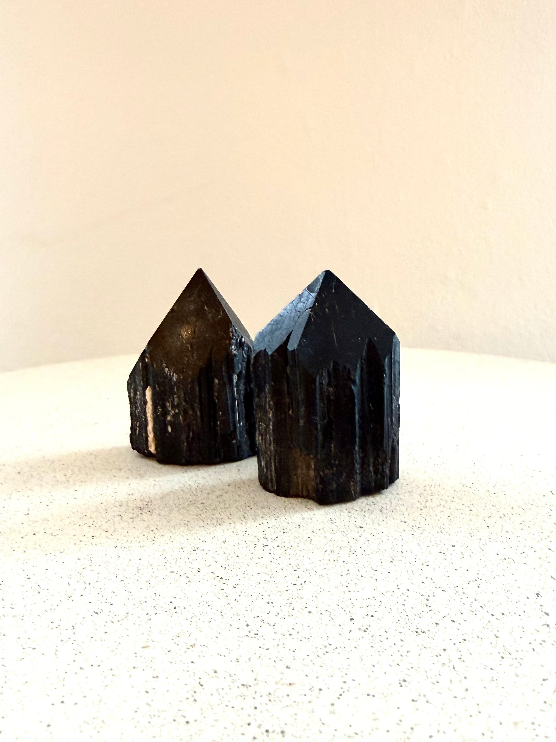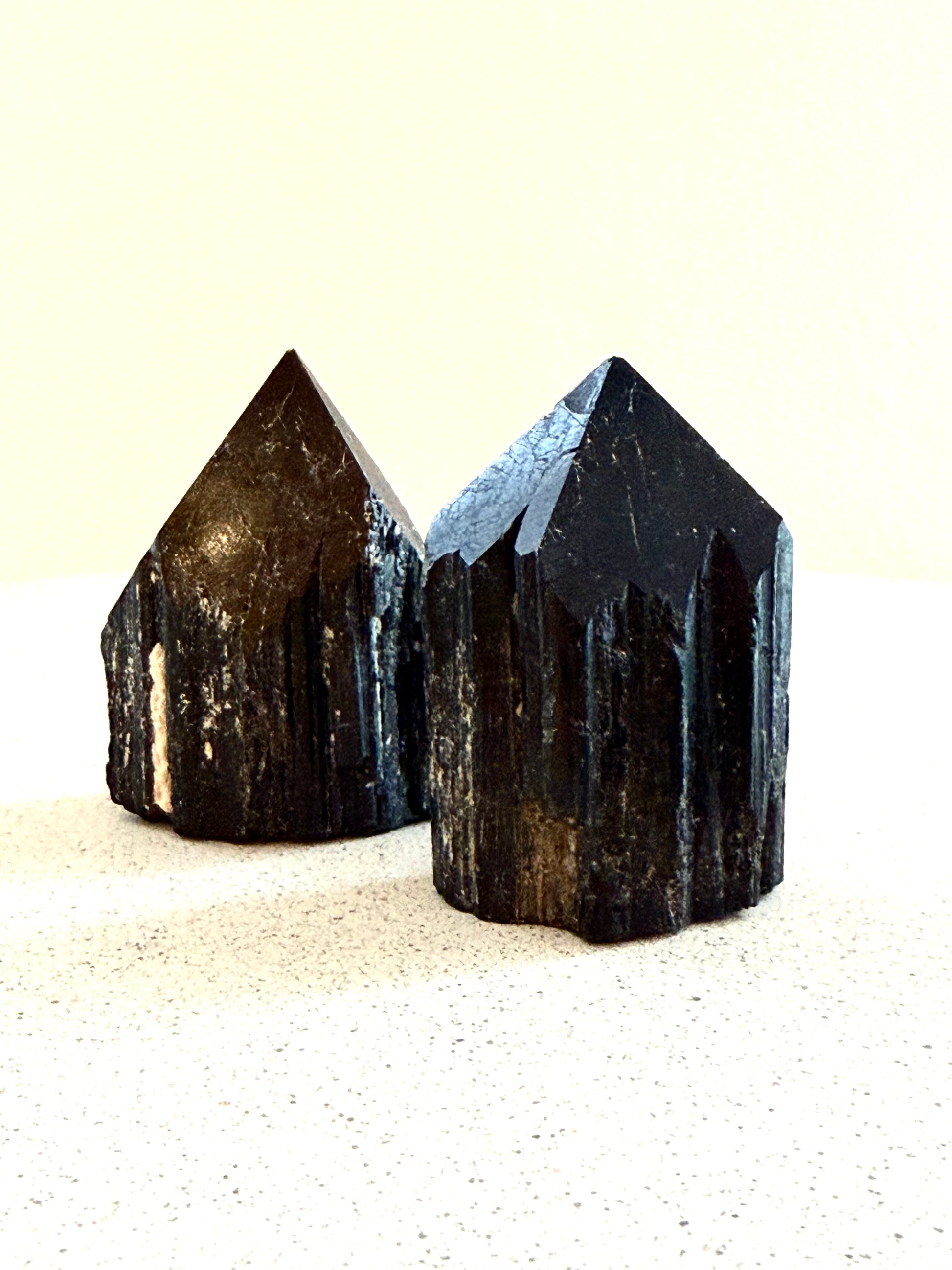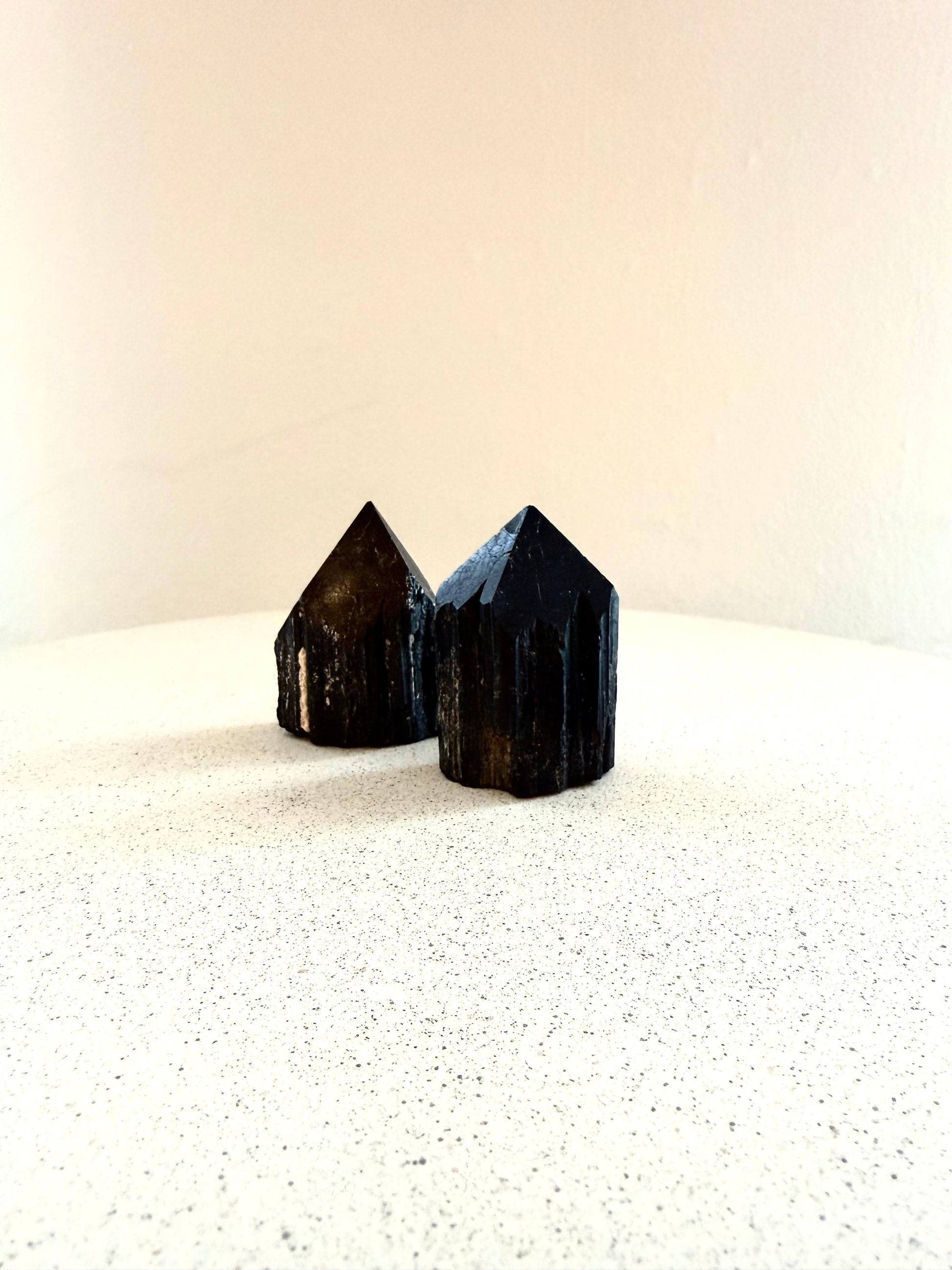Diese rohe Turmalinspitze ist pur, teilpoliert und vollkommen in ihrer Naturkraft. Schwarzer Turmalin zählt zu den stärksten Steinen, wenn es darum geht, zurück in den Körper, zurück ins Jetzt und zurück in eine klare energetische Linie zu finden.