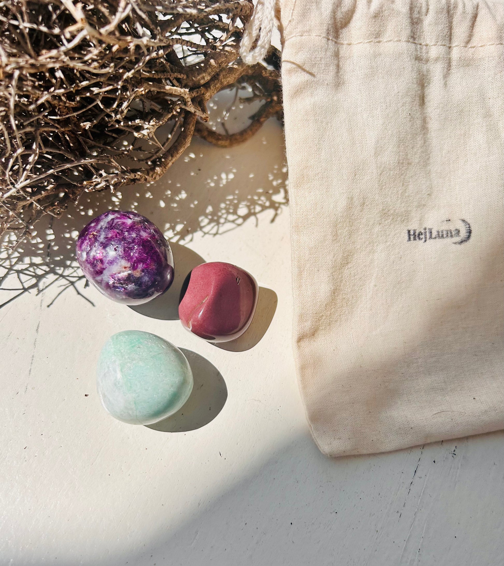 Die drei Trommelsteine kommen in einem kleinen Baumwollbeutel – gereinigt, aufgeladen und begleitet von einer liebevoll gestalteten Karte mit Beschreibung. Jeder Stein wird von mir intuitiv für dich ausgewählt – einzigartig wie dein eigener Wandel.