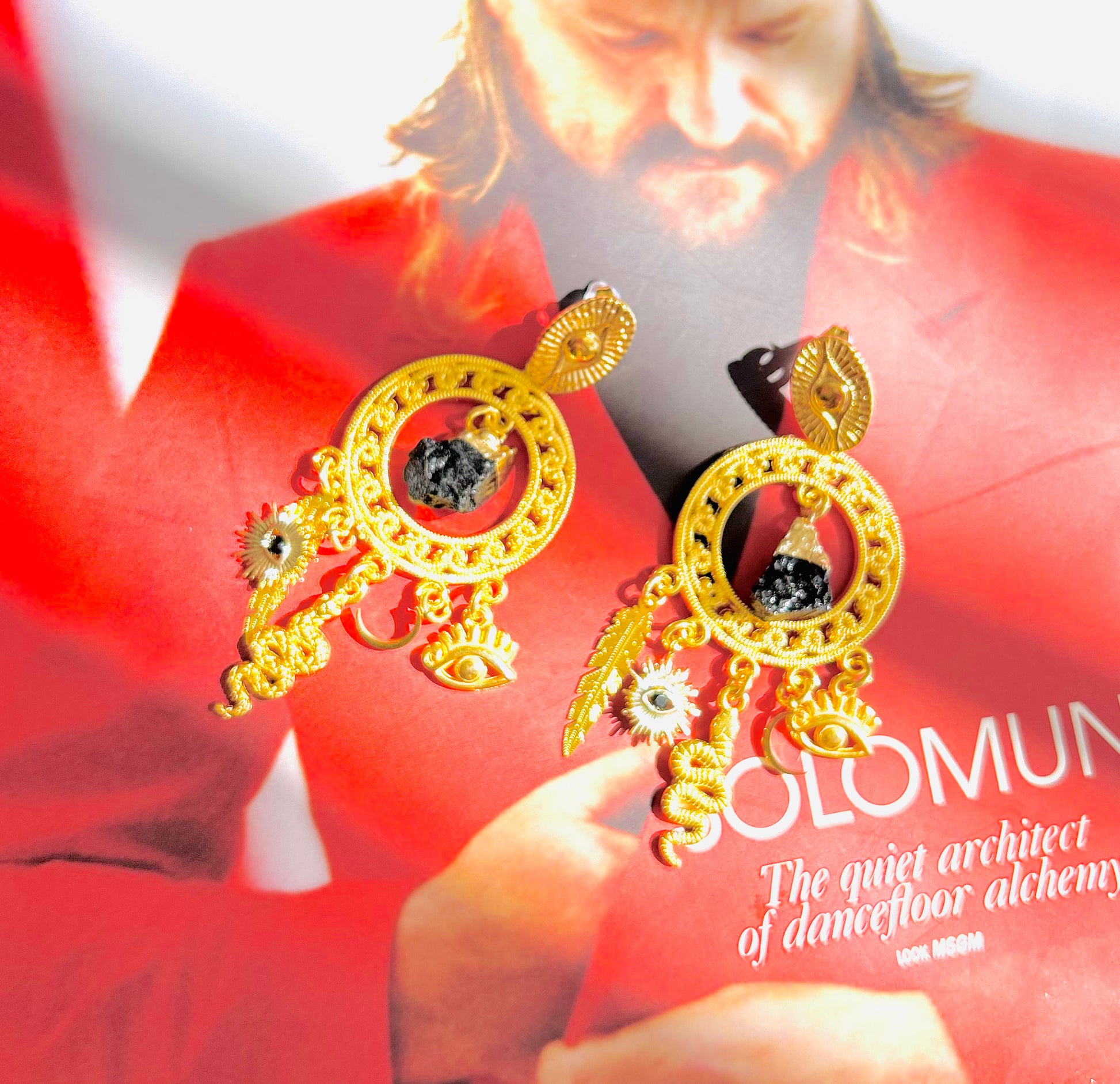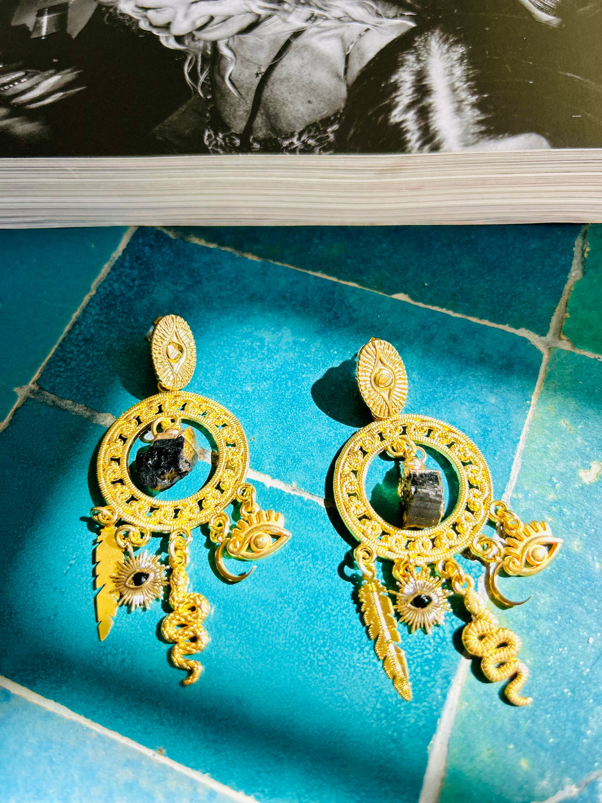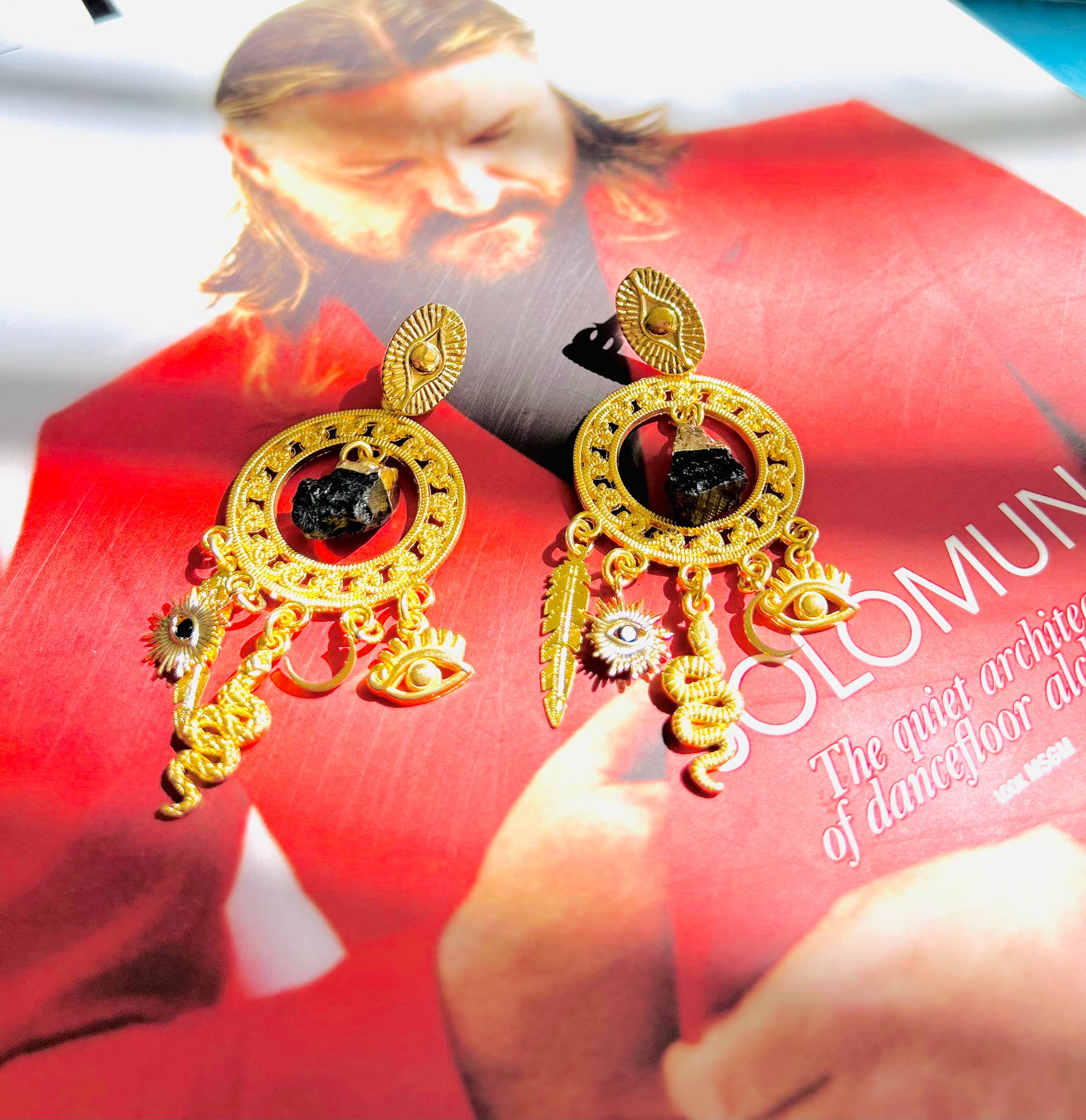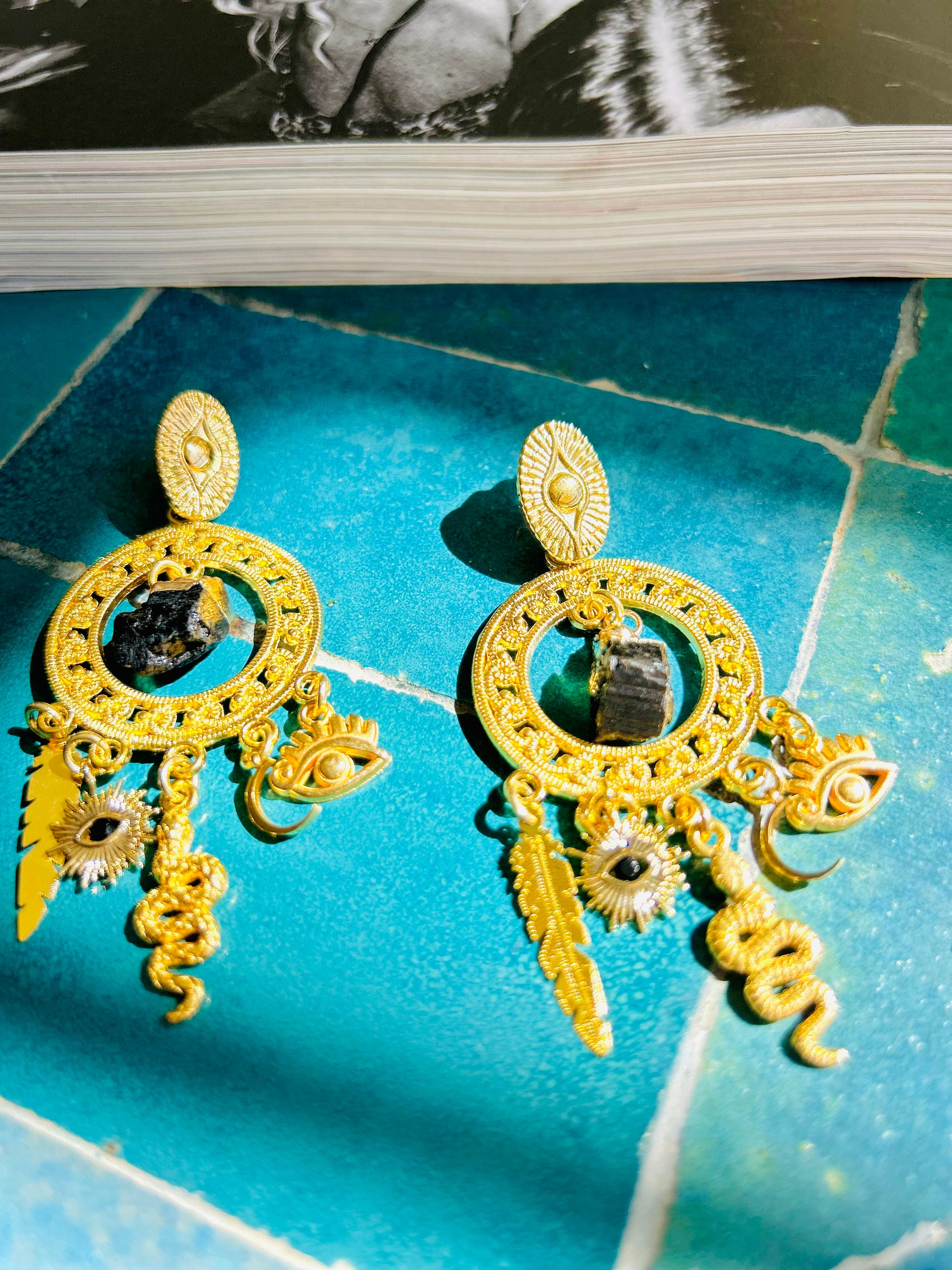 C: O-Ringe Edelstahl hochwertig vergoldet 7,5 cm mit Feder, Auge, Mond, Schlange und Turmalin