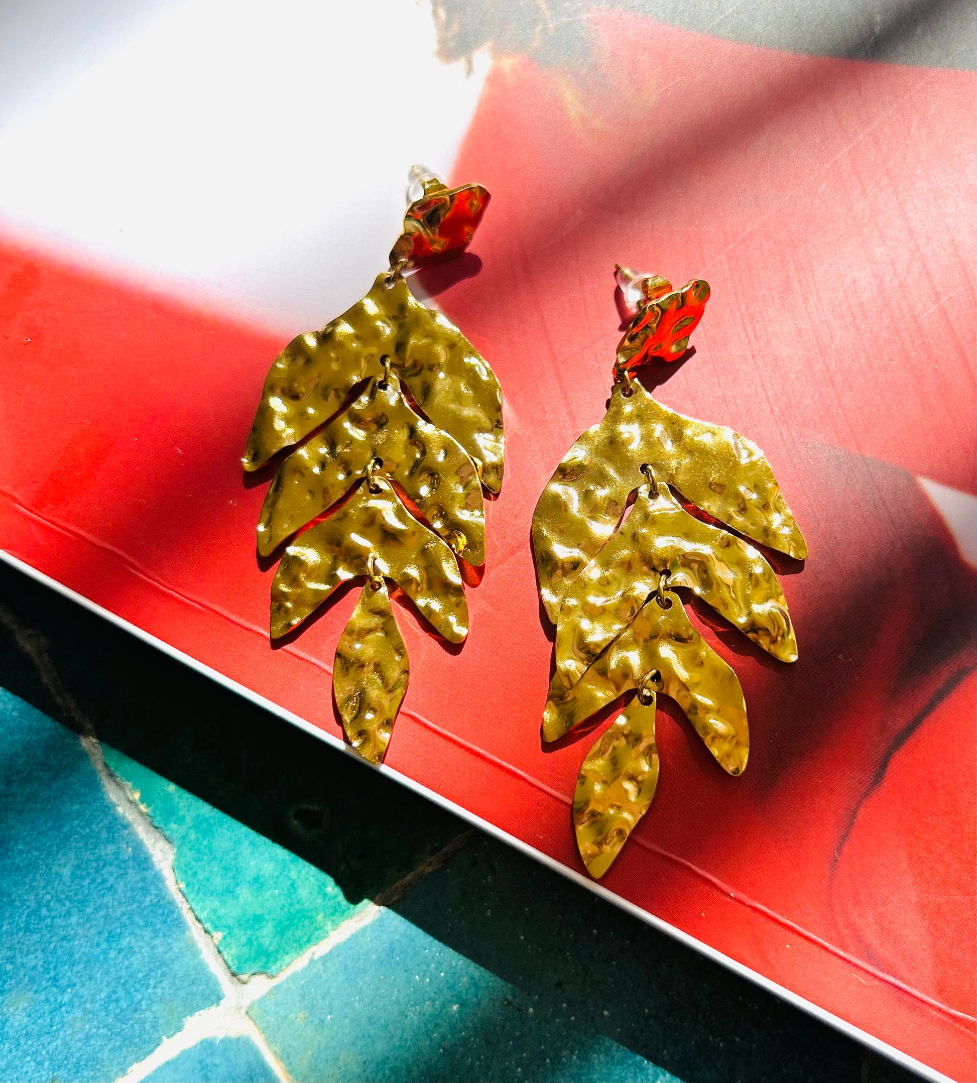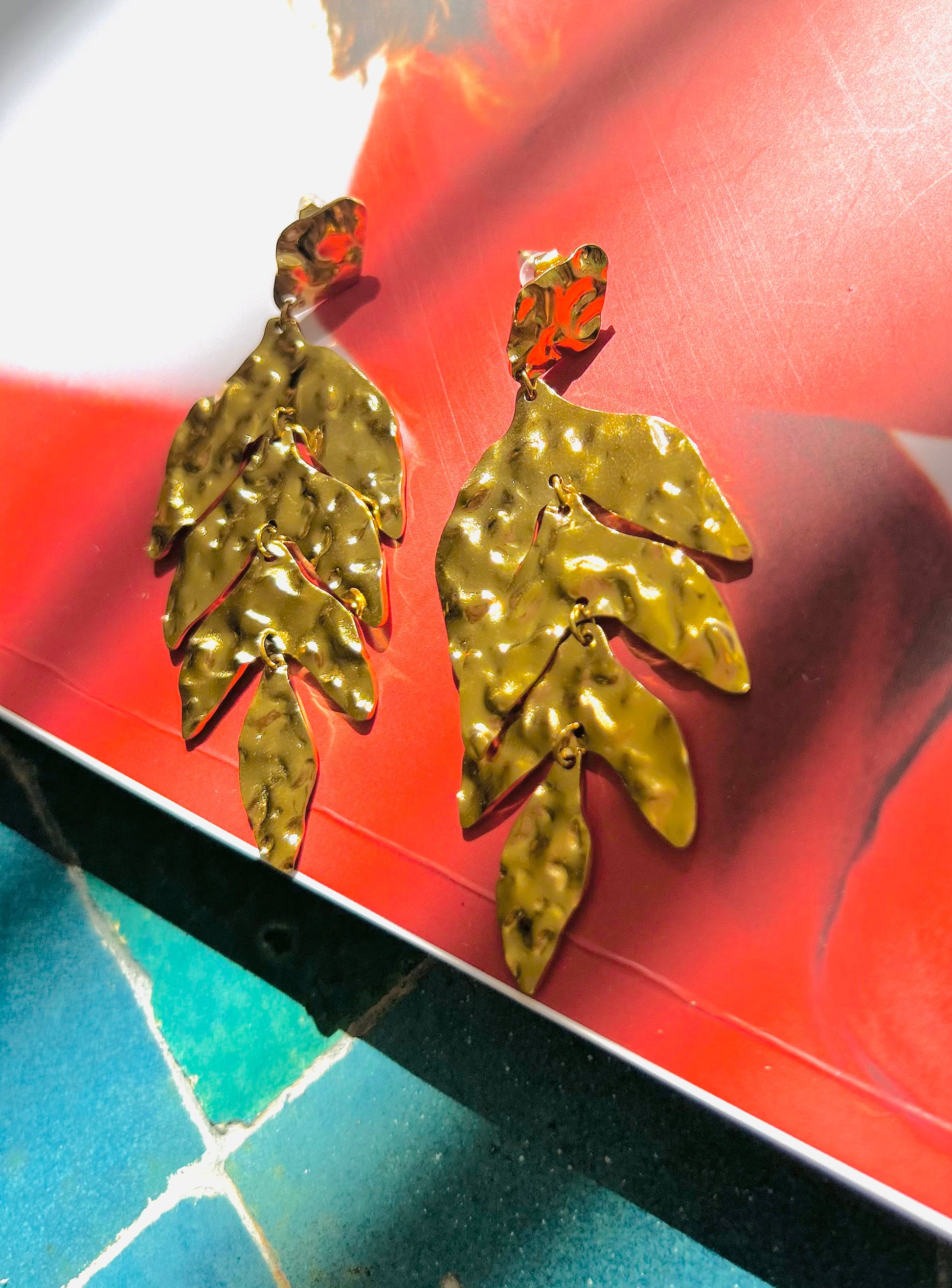 B:Hängende Ohrringe „Blätter“ – 7,4 × 3 cm Fein gearbeitete Blatt-Ohrringe aus goldfarbenem Edelstahl 316L.