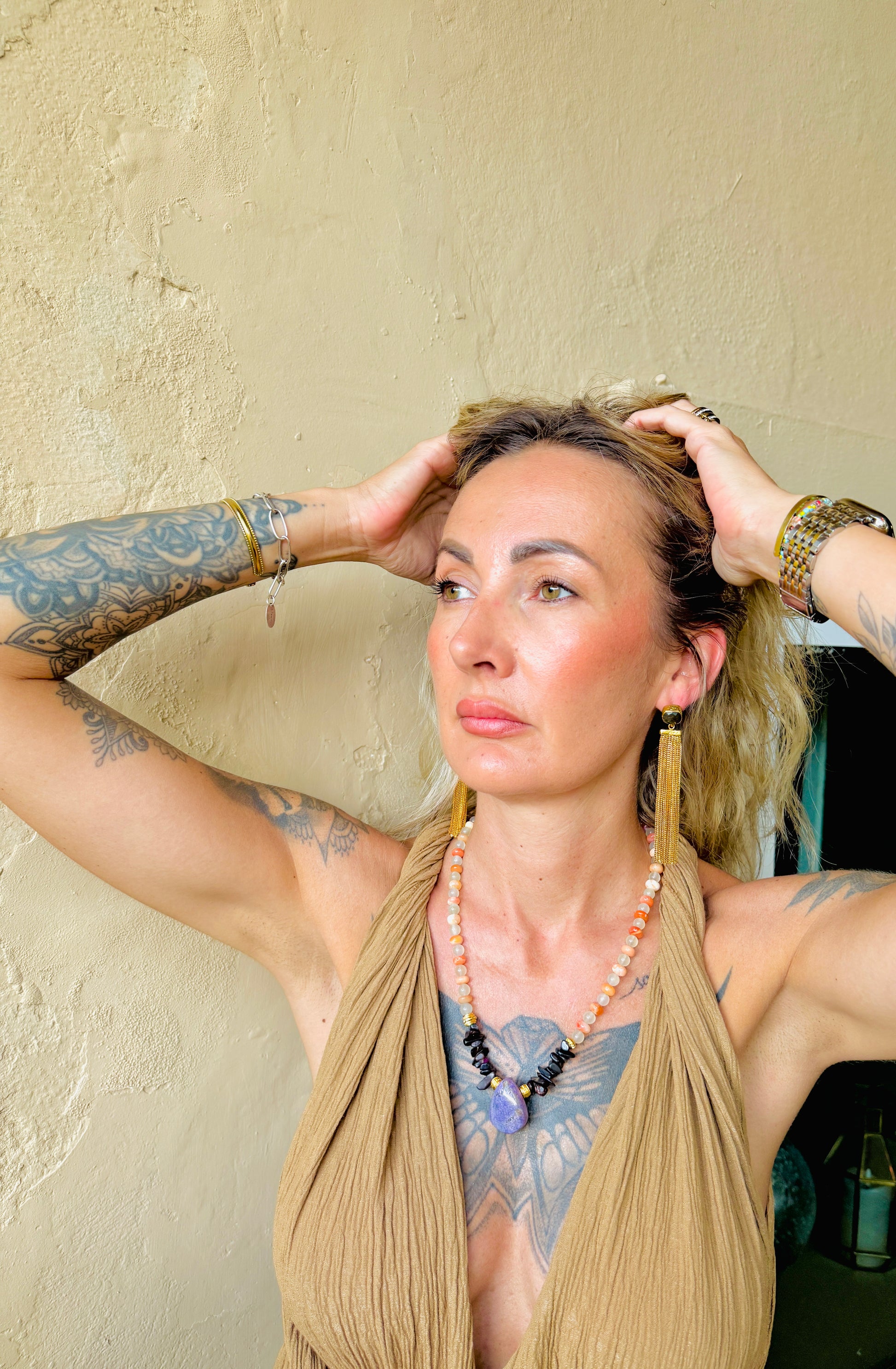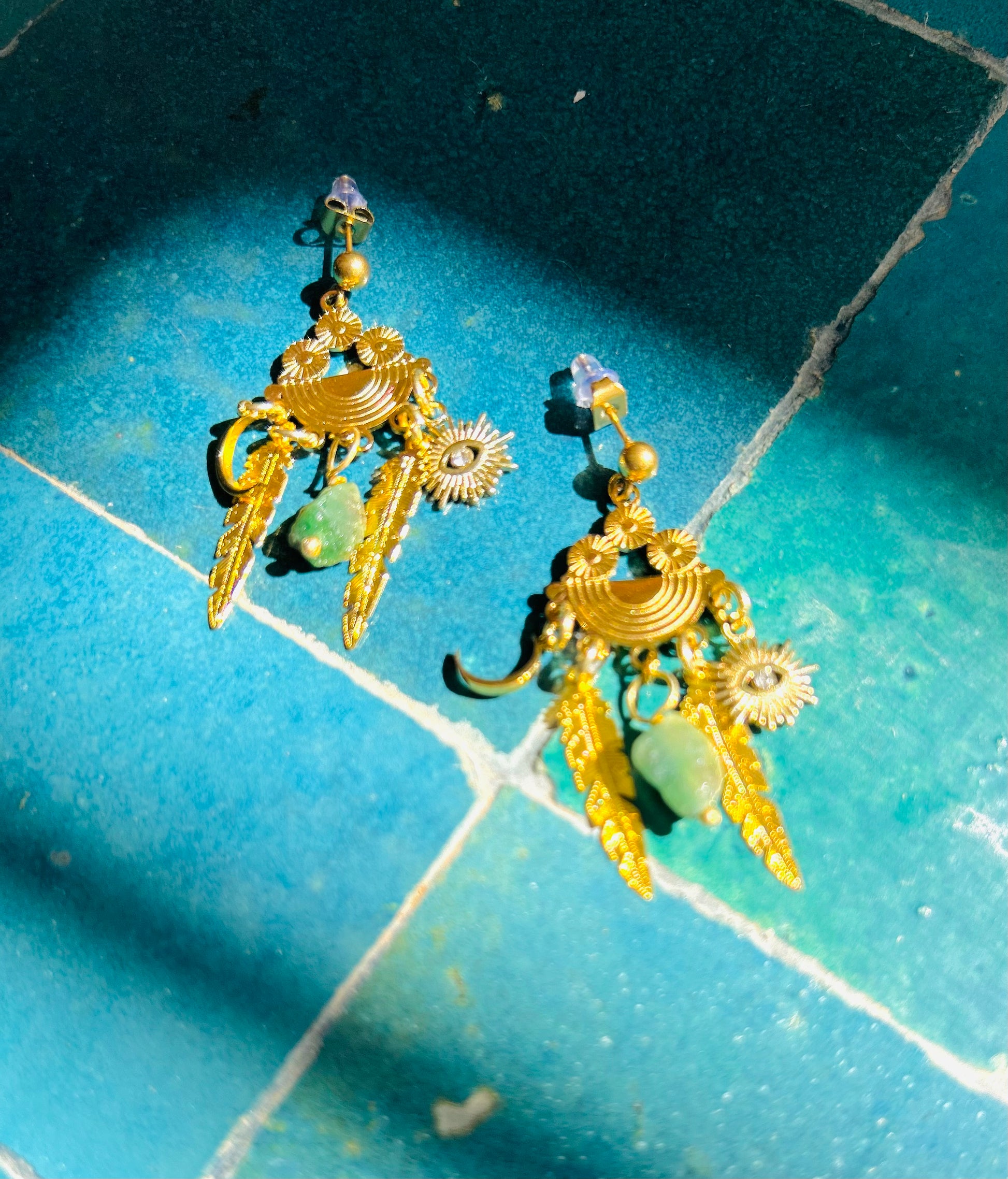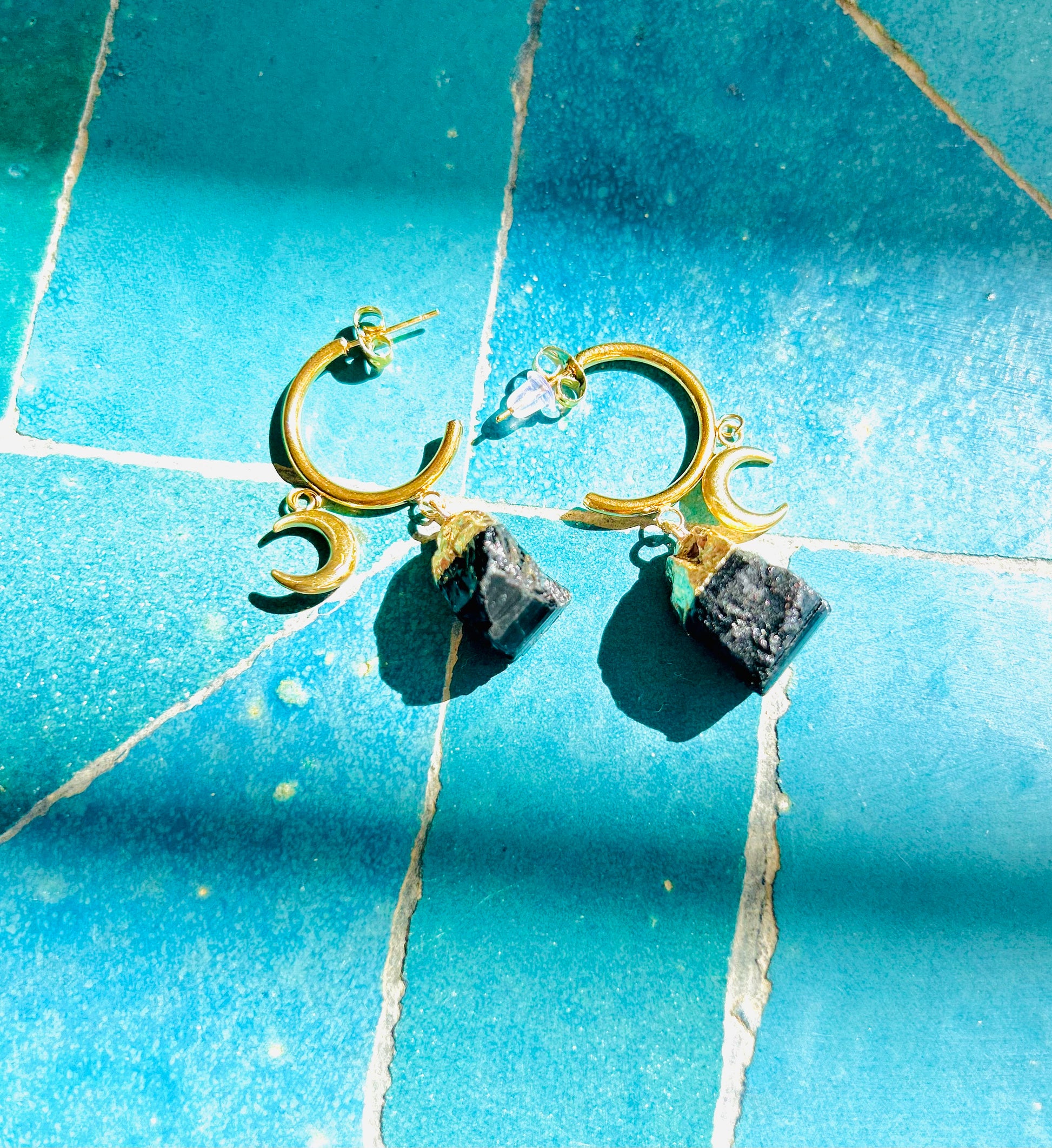 Edelstahl, hochwertig vergoldet · verziert mit kleinen Monden & Turmalin-Anhängern.