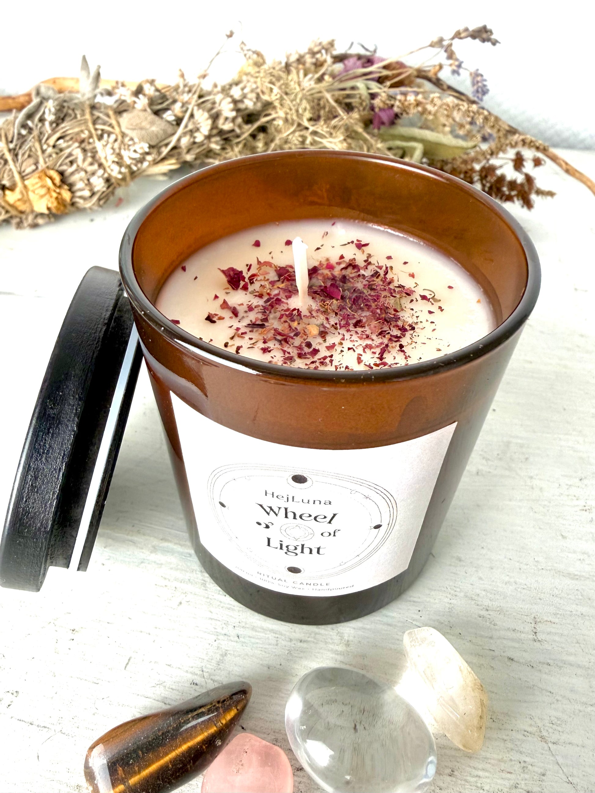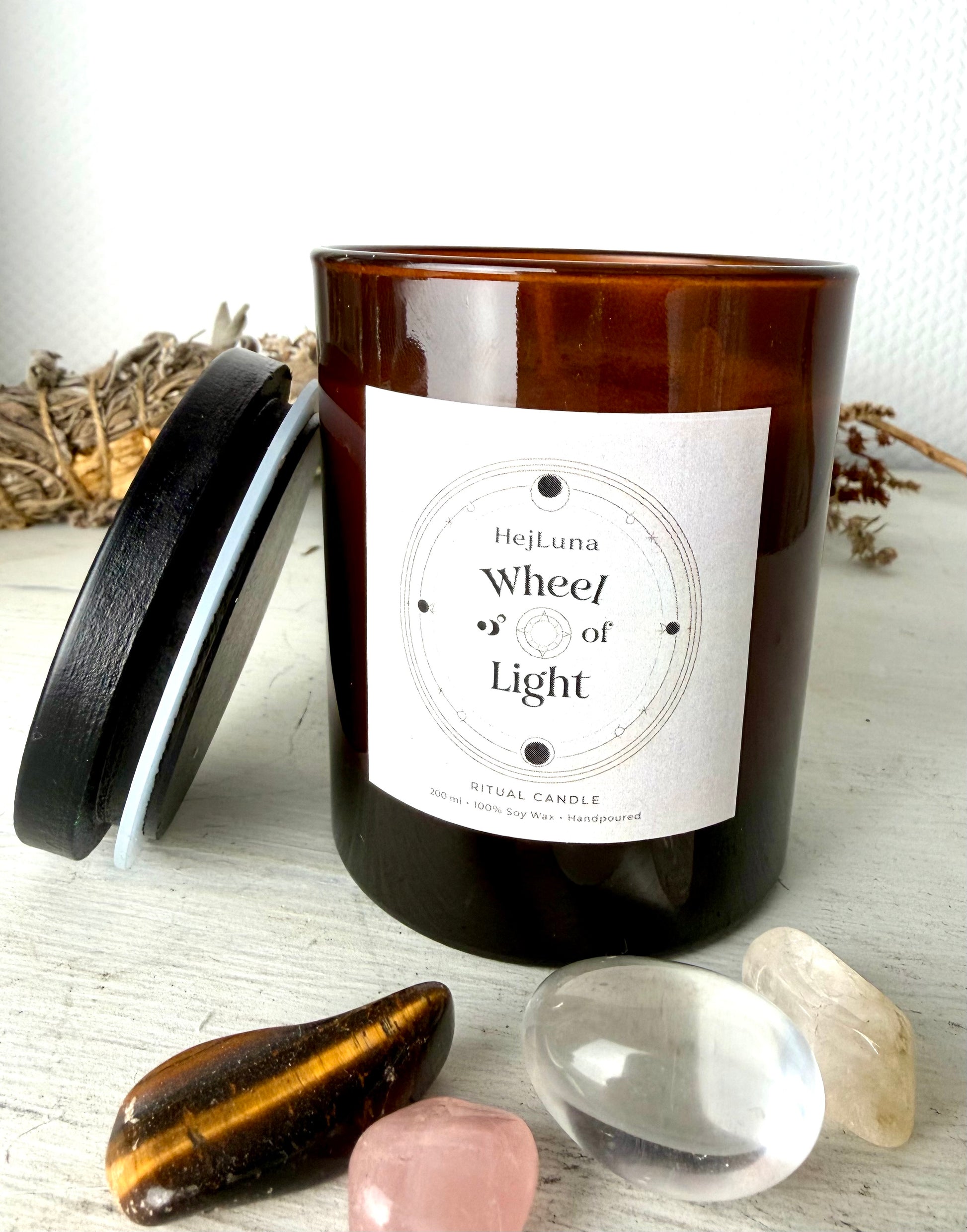 Bei jeder 200ml Kerze liegen acht Trommelsteine (Bergkristall, Amethyst, Moosachat, Karneol, Citrin, Tigerauge,versteinertes Holz und Rauchquarz) – als stiller Begleiter für deine eigenen Jahreskreisrituale.
